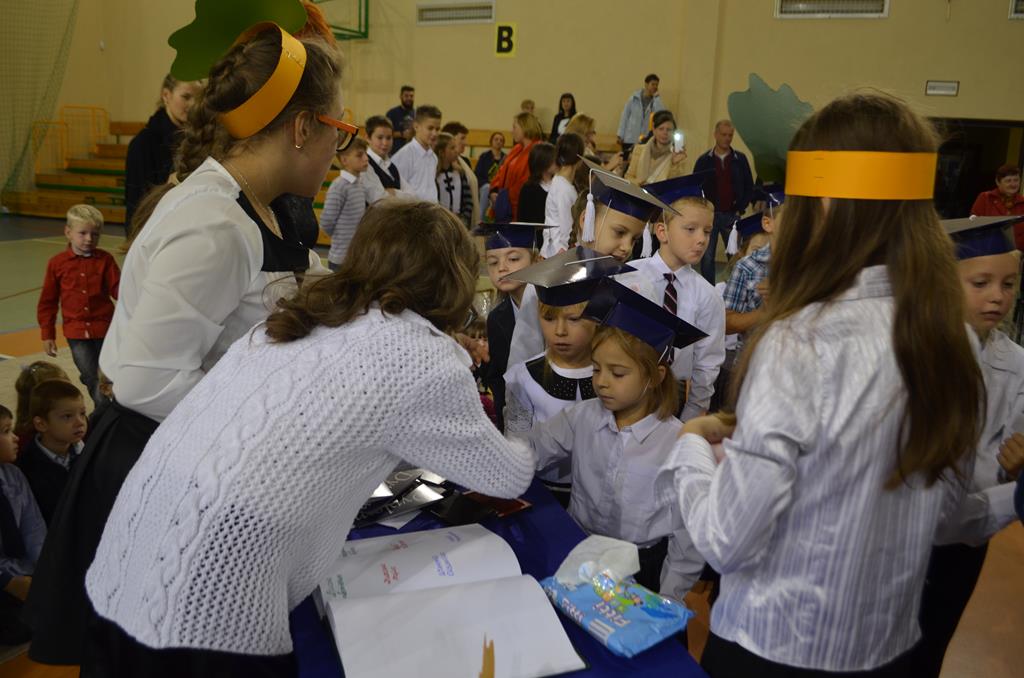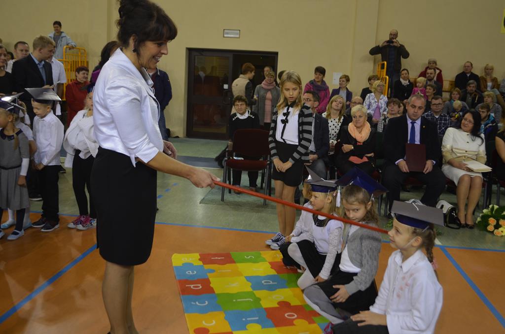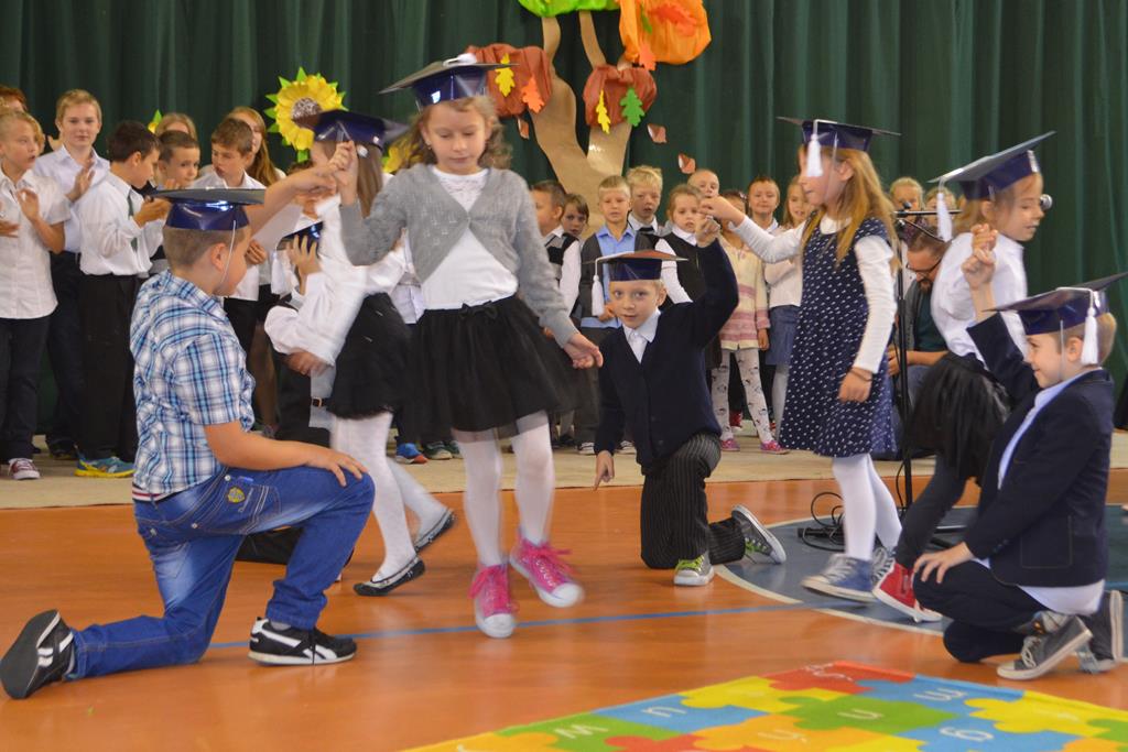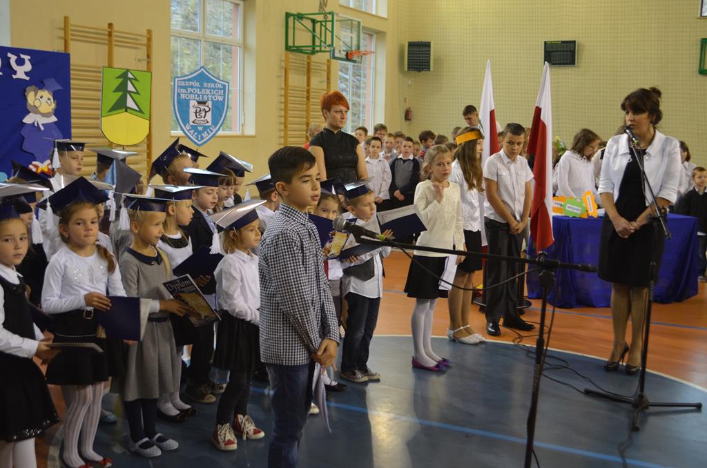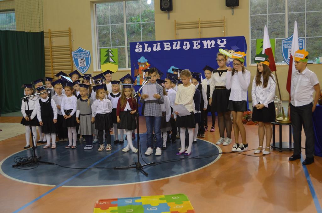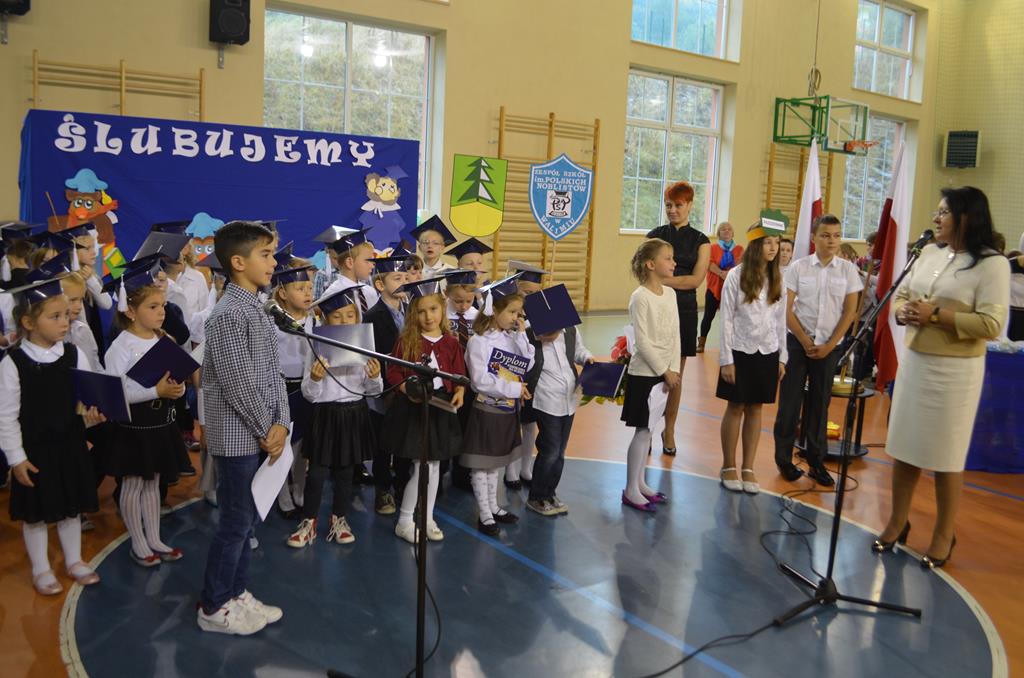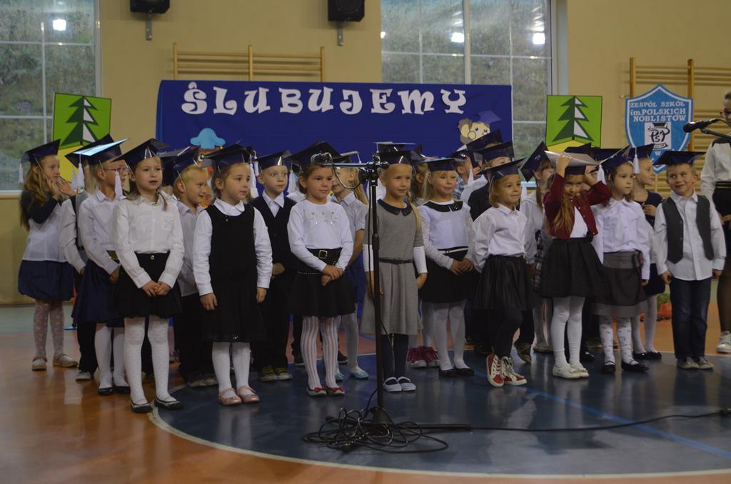 Od wielu lat 14 października w Zespole Szkół im. Polskich Noblistów jest podwójnym świętem – Dniem Edukacji Narodowej (potocznie zwanym Dniem Nauczyciela) oraz świętem pierwszaków, dniem w którym pasowani zostają oni na uczniów. Wśród publiczności oprócz rodziców, dziadków i zaproszonych gości zjawiła się także „Pani Jesień” wraz z ze swoimi jesiennymi miesiącami. Przygotowali oni dla pierwszaków mały test, odpytali ich z wiedzy o Polsce oraz zasad zachowania w szkole. Maluchy musiały wykazać się umiejętnością śpiewu i tańca oraz pracy w grupie przy sprzątaniu liści, które rozsypała Pani Jesień. Test został zaliczony i można było już przystąpić do ślubowania, jeszcze tylko tradycyjnie „próba cytrynowa”. Polega ona na tym, że należy wypić sok z cytryny i szeroko się uśmiechnąć. Przystąpili do niej, oprócz bohaterów uroczystości, pani dyrektor szkoły Małgorzata Jarczok, pani wice dyrektor Greta Piasecka – Gajdzis, wychowawczynie klas pierwszych pani Magdalena Ciołkowska i Izabella Woldan oraz zaproszeni goście i przedstawiciele rodziców. Próba przebiegła pomyślnie – wszyscy szeroko się uśmiechnęli. Teraz nastąpił uroczysty akt ślubowania, a następnie pani dyrektor Małgorzata Jarczok dokonała uroczystego pasowania na uczniów. Kolejnym etapem uroczystości było odbicie przez pierwszaków swoich odcisków w Księdze Pierwszoklasistów. Przy sprawnym przebiegu uroczystości pomagali uczniowie klasy VI, którzy obdarowali swoich młodszych kolegów słodkościami, a dla nauczycieli z okazji ich święta przygotowali śpiewającą niespodziankę.
