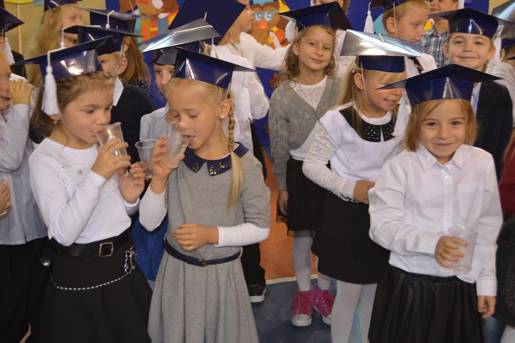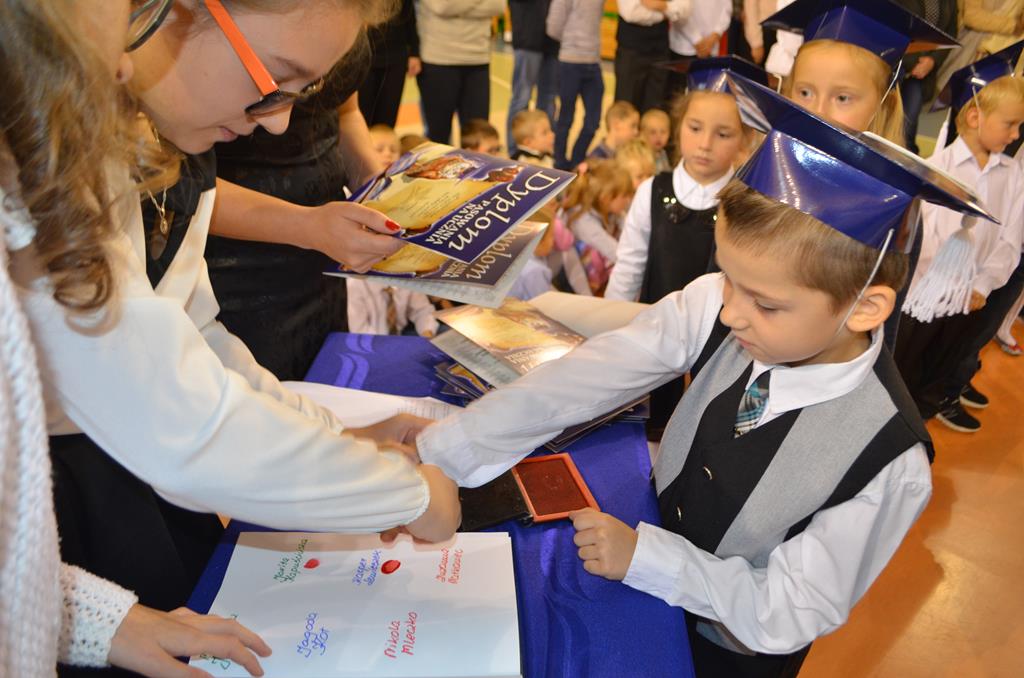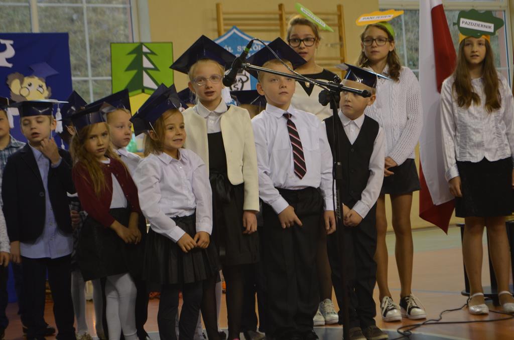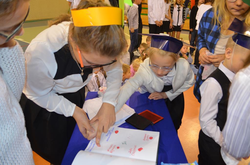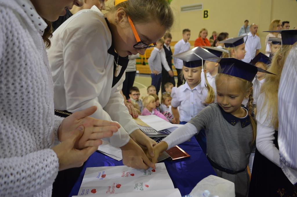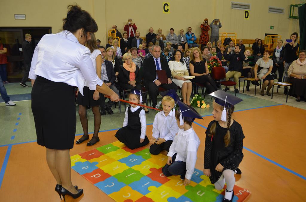 Od wielu lat 14 października w Zespole Szkół im. Polskich Noblistów jest podwójnym świętem – Dniem Edukacji Narodowej (potocznie zwanym Dniem Nauczyciela) oraz świętem pierwszaków, dniem w którym pasowani zostają oni na uczniów. Wśród publiczności oprócz rodziców, dziadków i zaproszonych gości zjawiła się także „Pani Jesień” wraz z ze swoimi jesiennymi miesiącami. Przygotowali oni dla pierwszaków mały test, odpytali ich z wiedzy o Polsce oraz zasad zachowania w szkole. Maluchy musiały wykazać się umiejętnością śpiewu i tańca oraz pracy w grupie przy sprzątaniu liści, które rozsypała Pani Jesień. Test został zaliczony i można było już przystąpić do ślubowania, jeszcze tylko tradycyjnie „próba cytrynowa”. Polega ona na tym, że należy wypić sok z cytryny i szeroko się uśmiechnąć. Przystąpili do niej, oprócz bohaterów uroczystości, pani dyrektor szkoły Małgorzata Jarczok, pani wice dyrektor Greta Piasecka – Gajdzis, wychowawczynie klas pierwszych pani Magdalena Ciołkowska i Izabella Woldan oraz zaproszeni goście i przedstawiciele rodziców. Próba przebiegła pomyślnie – wszyscy szeroko się uśmiechnęli. Teraz nastąpił uroczysty akt ślubowania, a następnie pani dyrektor Małgorzata Jarczok dokonała uroczystego pasowania na uczniów. Kolejnym etapem uroczystości było odbicie przez pierwszaków swoich odcisków w Księdze Pierwszoklasistów. Przy sprawnym przebiegu uroczystości pomagali uczniowie klasy VI, którzy obdarowali swoich młodszych kolegów słodkościami, a dla nauczycieli z okazji ich święta przygotowali śpiewającą niespodziankę.