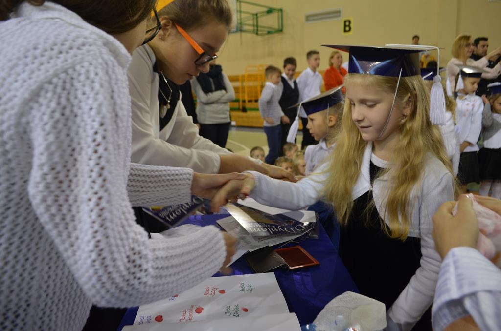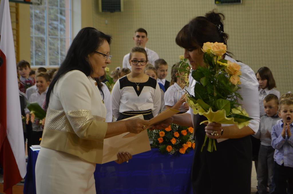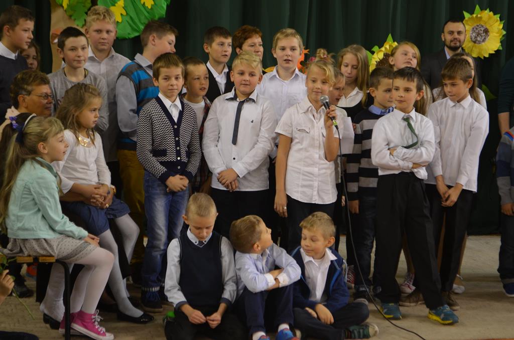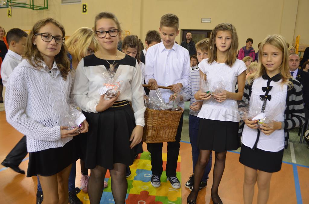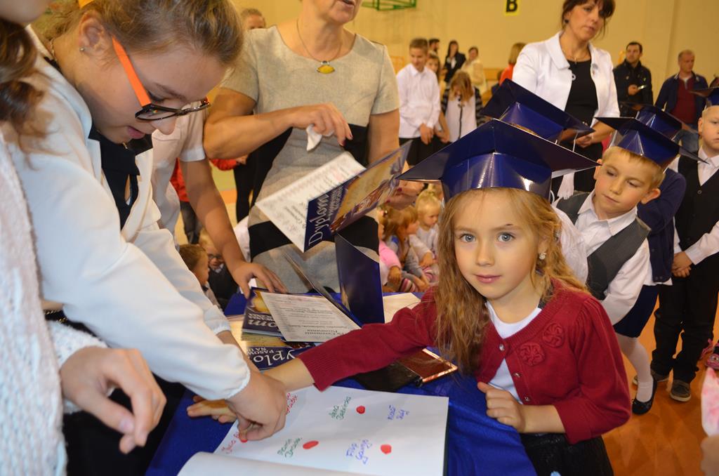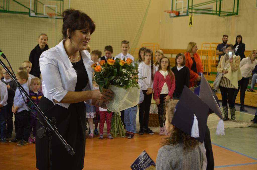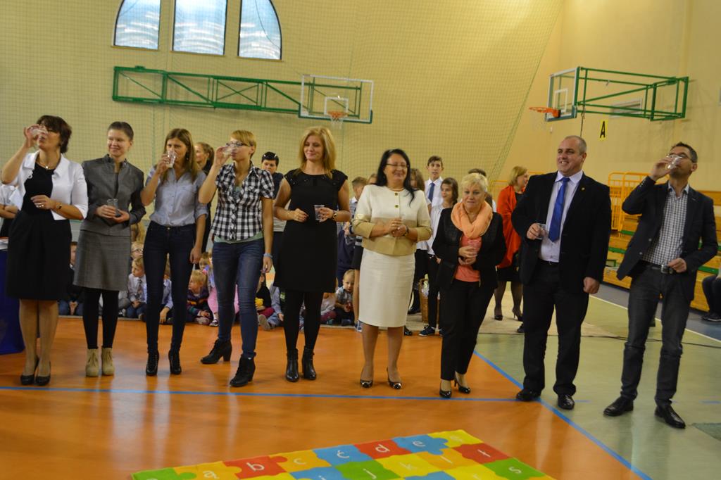 Od wielu lat 14 października w Zespole Szkół im. Polskich Noblistów jest podwójnym świętem – Dniem Edukacji Narodowej (potocznie zwanym Dniem Nauczyciela) oraz świętem pierwszaków, dniem w którym pasowani zostają oni na uczniów. Wśród publiczności oprócz rodziców, dziadków i zaproszonych gości zjawiła się także „Pani Jesień” wraz z ze swoimi jesiennymi miesiącami. Przygotowali oni dla pierwszaków mały test, odpytali ich z wiedzy o Polsce oraz zasad zachowania w szkole. Maluchy musiały wykazać się umiejętnością śpiewu i tańca oraz pracy w grupie przy sprzątaniu liści, które rozsypała Pani Jesień. Test został zaliczony i można było już przystąpić do ślubowania, jeszcze tylko tradycyjnie „próba cytrynowa”. Polega ona na tym, że należy wypić sok z cytryny i szeroko się uśmiechnąć. Przystąpili do niej, oprócz bohaterów uroczystości, pani dyrektor szkoły Małgorzata Jarczok, pani wice dyrektor Greta Piasecka – Gajdzis, wychowawczynie klas pierwszych pani Magdalena Ciołkowska i Izabella Woldan oraz zaproszeni goście i przedstawiciele rodziców. Próba przebiegła pomyślnie – wszyscy szeroko się uśmiechnęli. Teraz nastąpił uroczysty akt ślubowania, a następnie pani dyrektor Małgorzata Jarczok dokonała uroczystego pasowania na uczniów. Kolejnym etapem uroczystości było odbicie przez pierwszaków swoich odcisków w Księdze Pierwszoklasistów. Przy sprawnym przebiegu uroczystości pomagali uczniowie klasy VI, którzy obdarowali swoich młodszych kolegów słodkościami, a dla nauczycieli z okazji ich święta przygotowali śpiewającą niespodziankę.