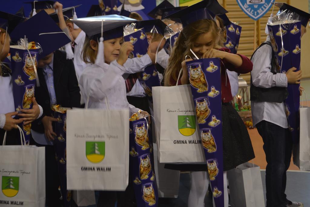 Tego dnia na pierwszaków spadł deszcz prezentów – od wójta gminy Walim pana Adama Hausmana, które przekazała sekretarz gminy pani Aleksandra Ignaszak, od pani Urszuli Witek – kierownika Gminnego Zespołu Obsługi Szkół oraz oczywiście od rodziców. A na zakończenie wspaniałe przyjęcie i zabawa przy muzyce dla pierwszaków, rodziców i zaproszonych gości.