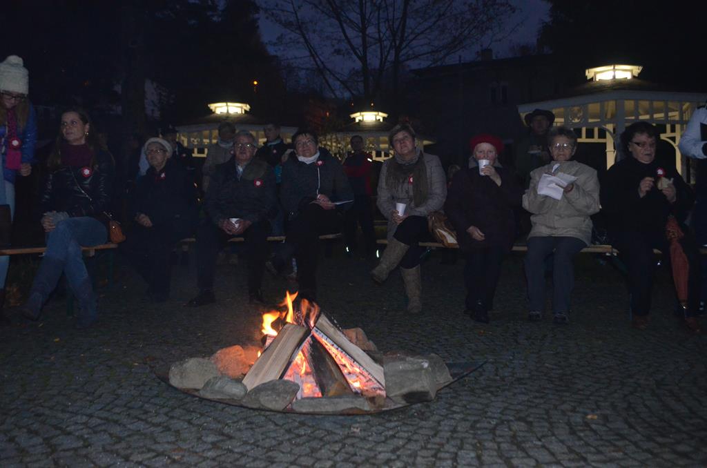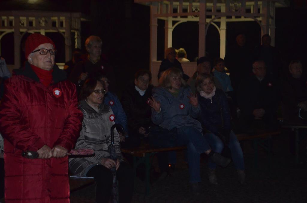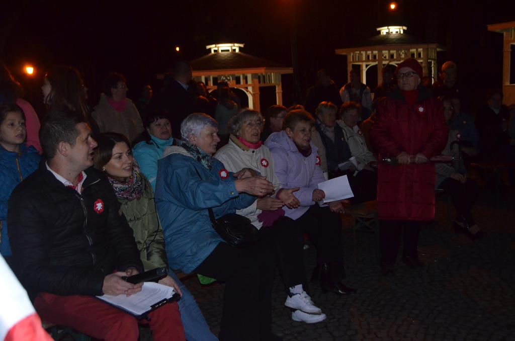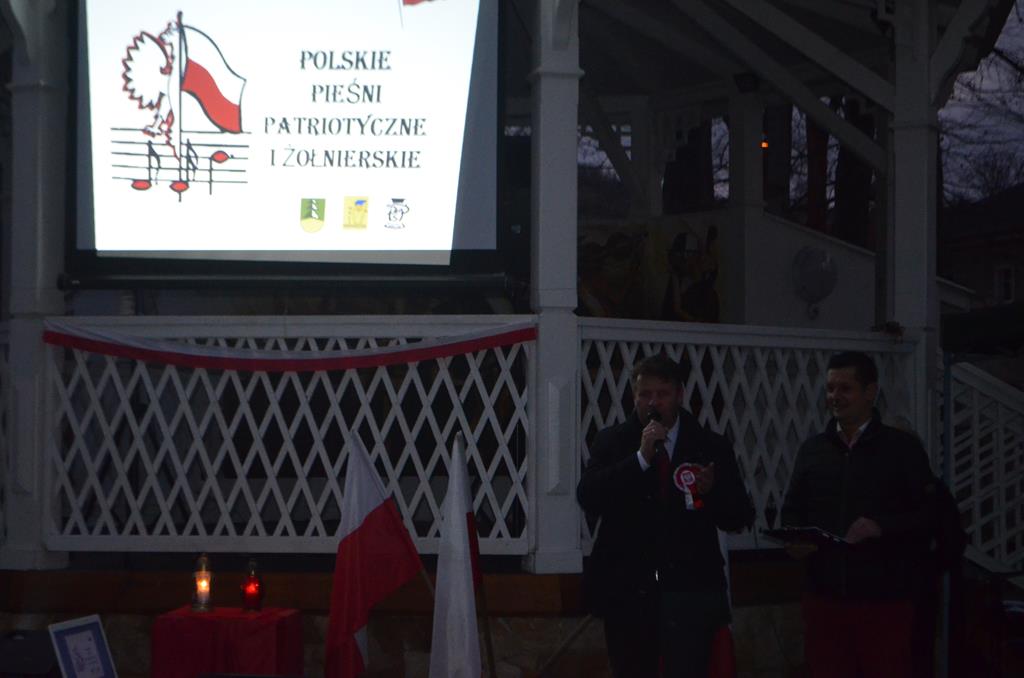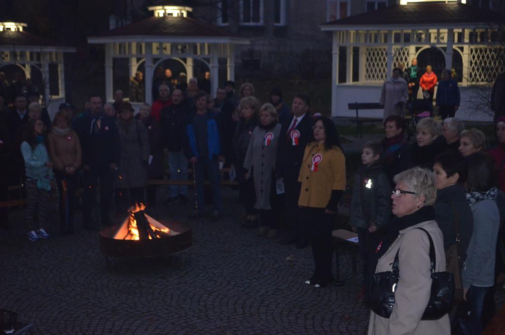 Po mszy świętej wszyscy zebrali się w Parku Jordanowskim, by wspólnie przy płonących ogniskach i dźwiękach muzyki, poczuć “ducha niepodległościowego” śpiewając pieśni patriotyczne. Wspólne świętowanie ułatwiały przygotowane śpiewniki oraz prezentacja multimedialna, na której wyświetlano teksty najpopularniejszych utworów. Uroczystości tradycyjnie rozpoczęto odśpiewaniem hymnu polskiego. Nie zabrakło także znanych pieśni – O mój Rozmarynie, Serce w Plecaku, Kadrówka, Pierwsza brygada, Przybyli ułani pod okienko, Wojenko, wojenko, Oka, oraz wielu innych wzruszających utworów. Nad oprawą muzyczną oraz artystyczną czuwał Krzysztof Gołębiowski oraz Alicja Bekas wraz z uczniami Publicznej Szkoły Podstawowej im. Janusza Korczaka z Jugowic. Przerwy pomiędzy pieśniami wypełnione były patriotycznymi wierszami recytowanymi przez dzieci oraz wyświetlanymi krótkimi animacjami, ukazującymi zmianę granic Polski oraz burzliwą historię naszego kraju.