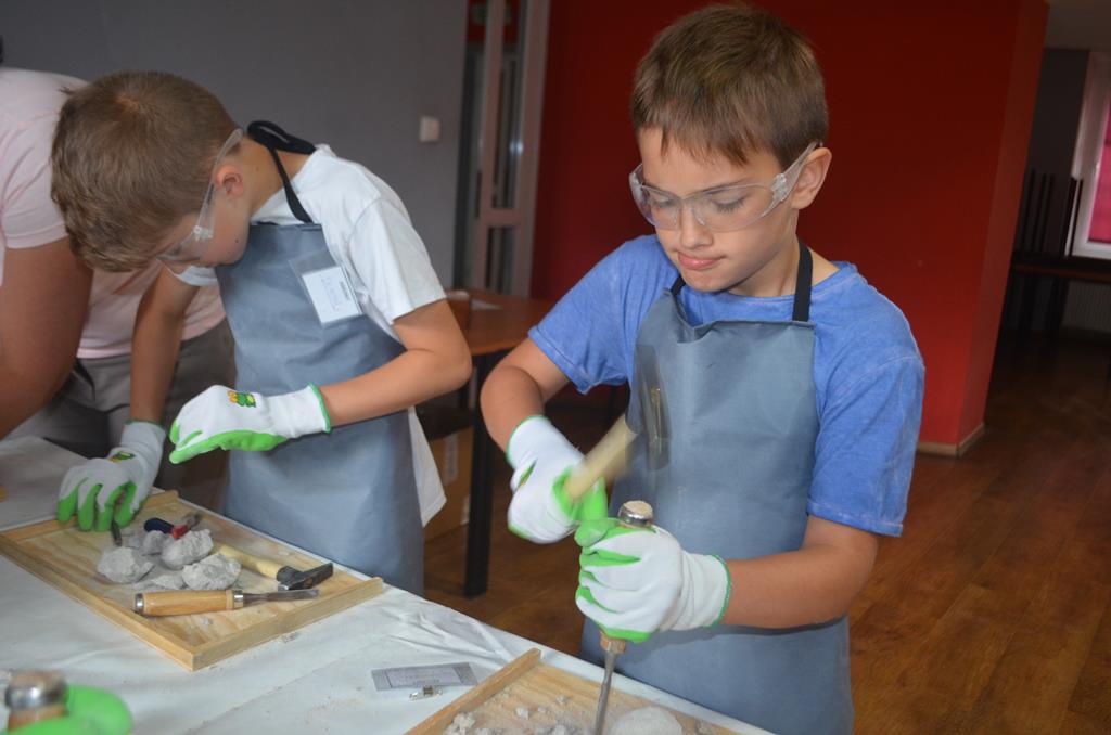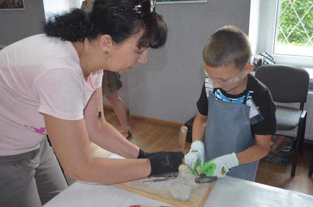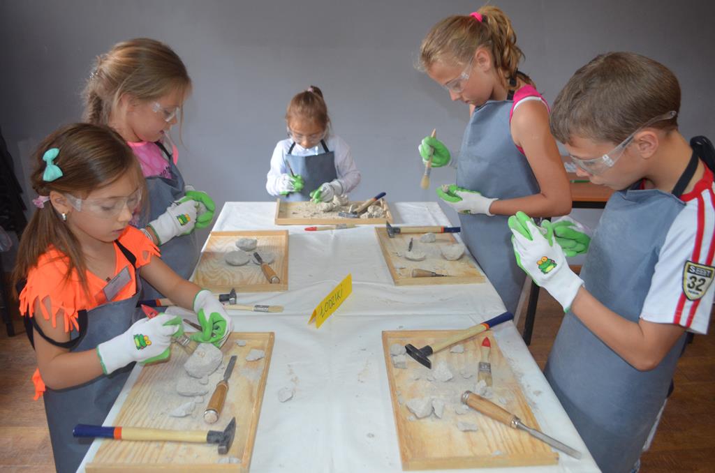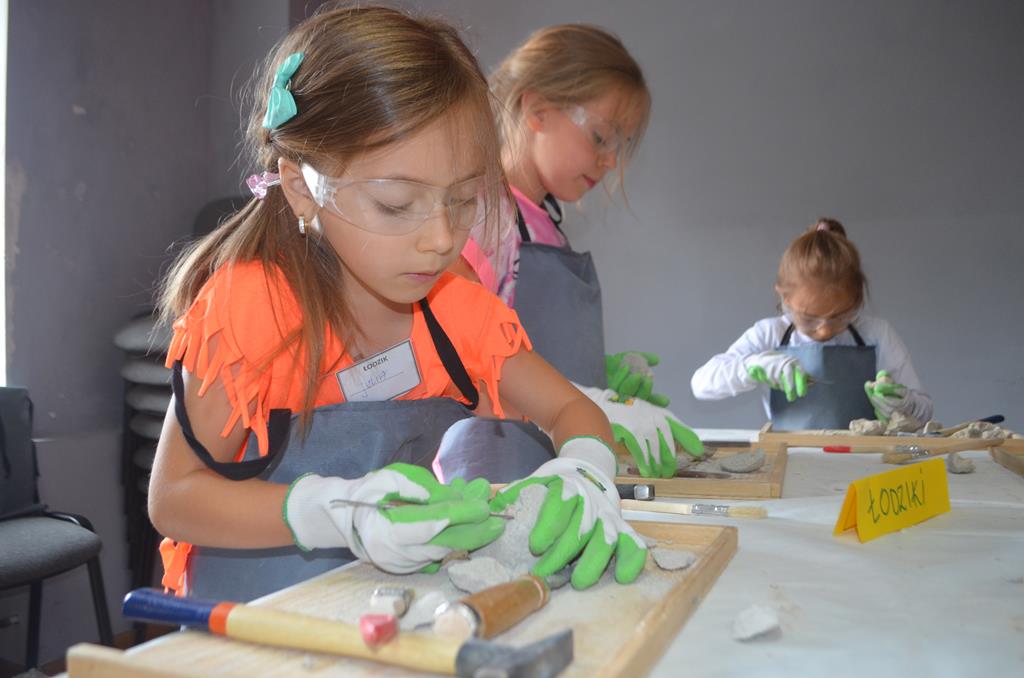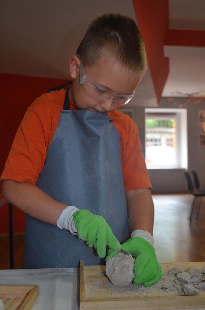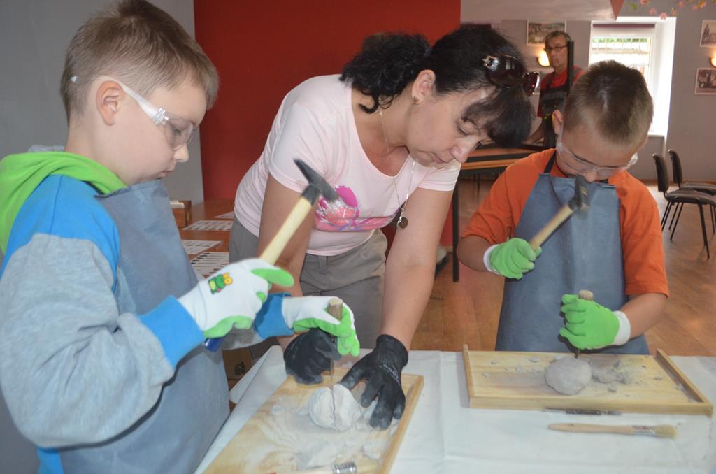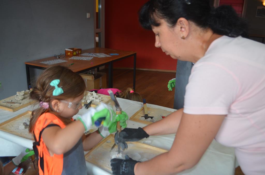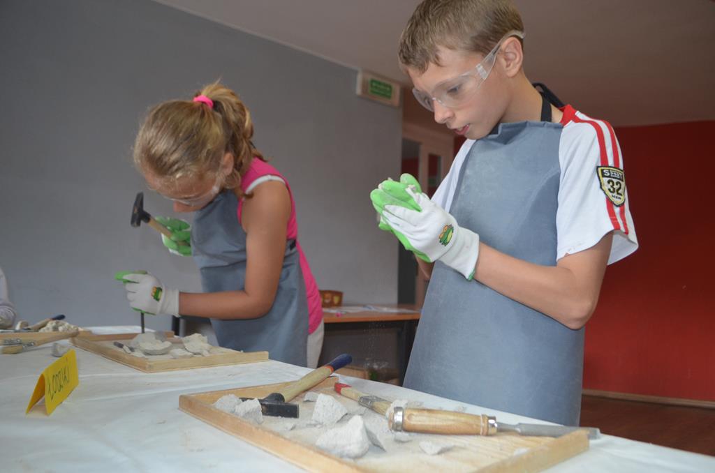 – MAŁY ODKRYWCA – dzieci otrzymały kulę piaskowo – gipsową, w której ukryte były pradawne ślimaki, małże, czy też belemnity. Do ich wydobycia małym odkrywcom posłużył wcześniej przygotowany warsztat pracy, a mianowicie: młotek, dłuto i pędzelek oraz ochronny fartuch i okulary.