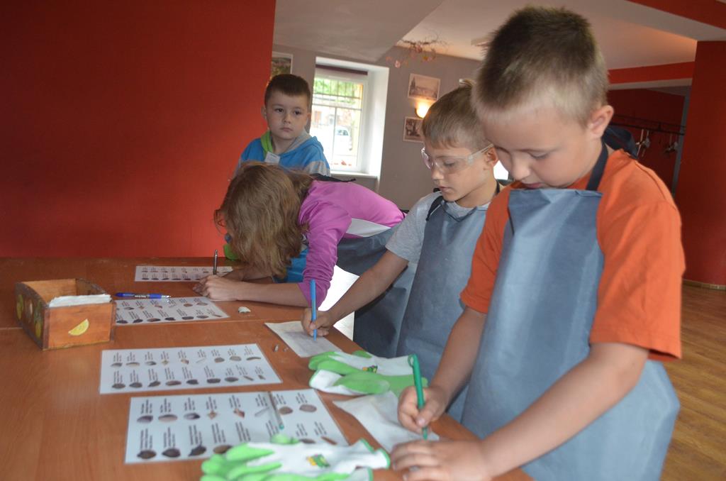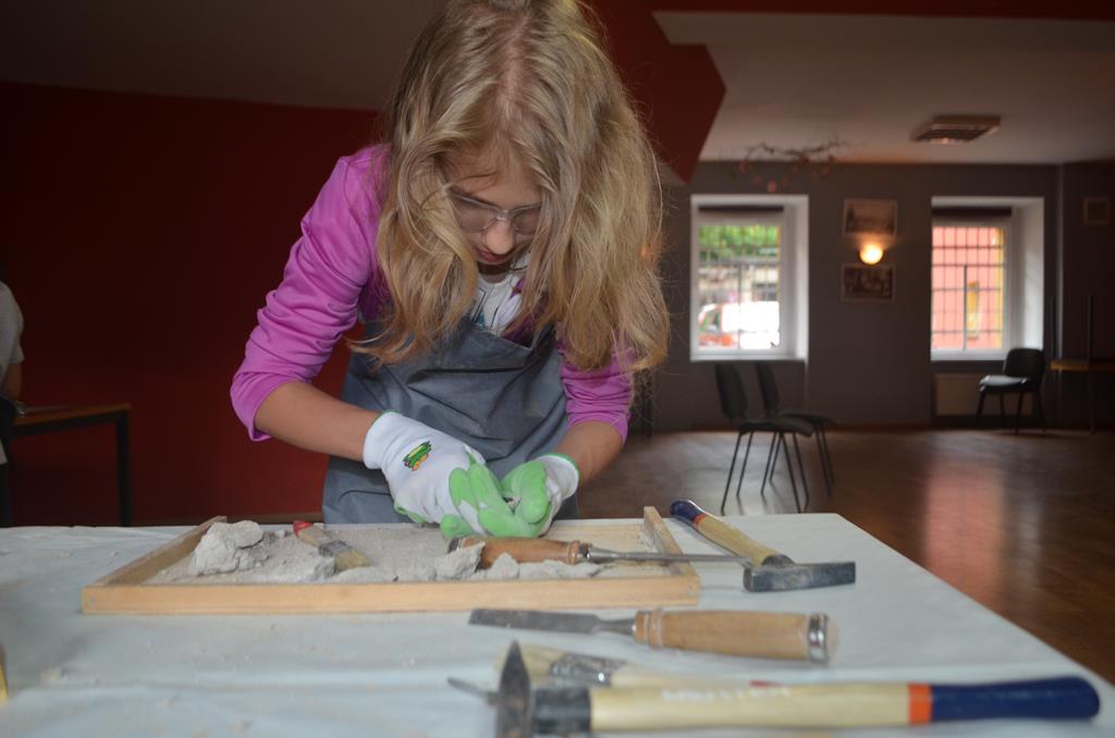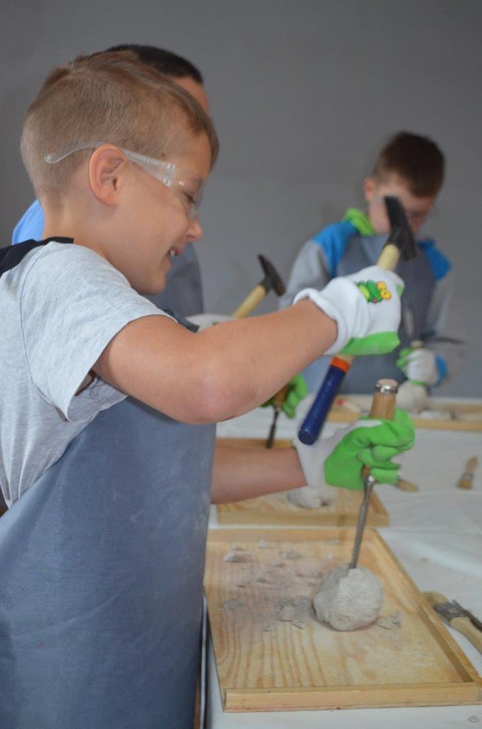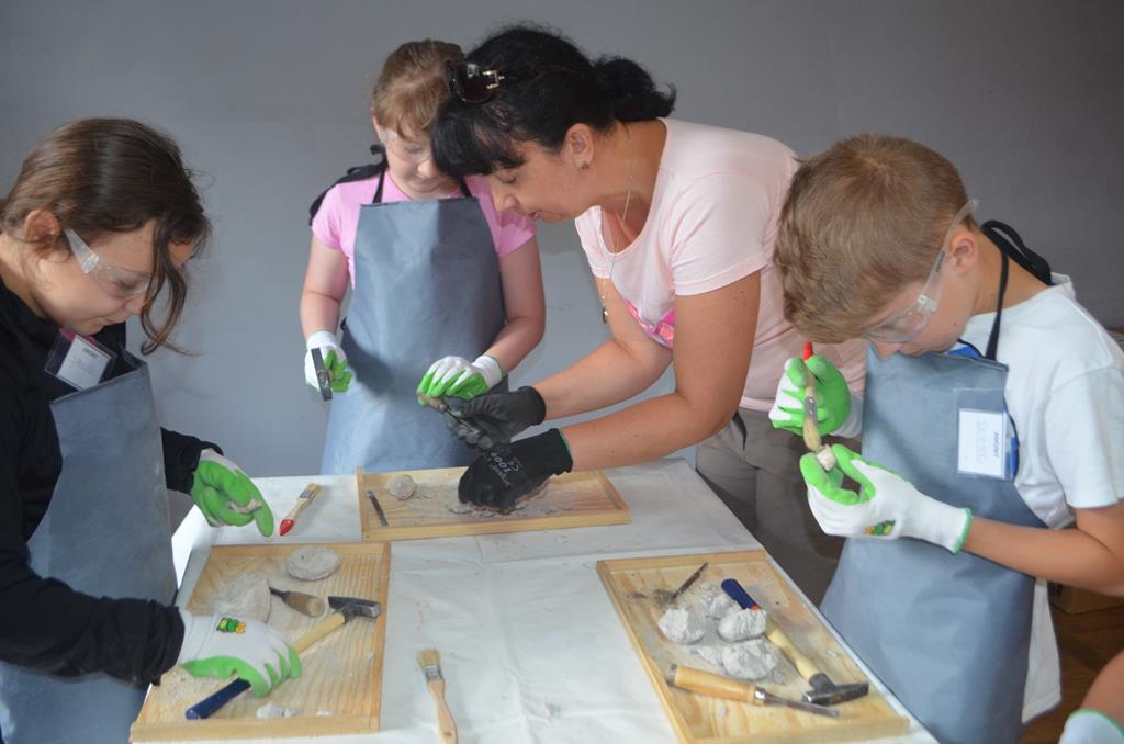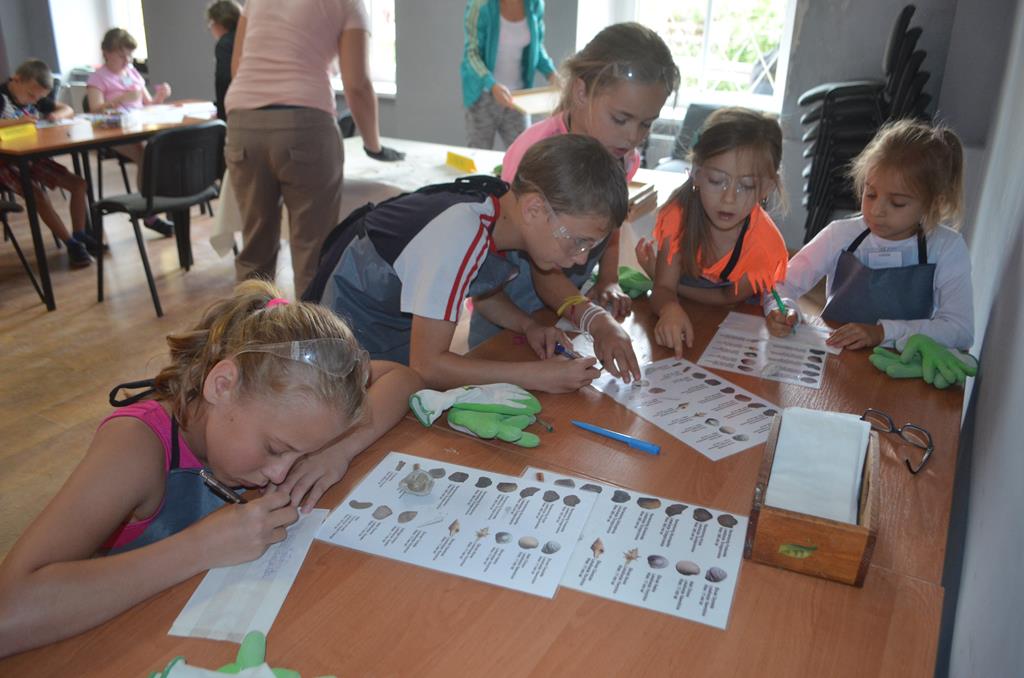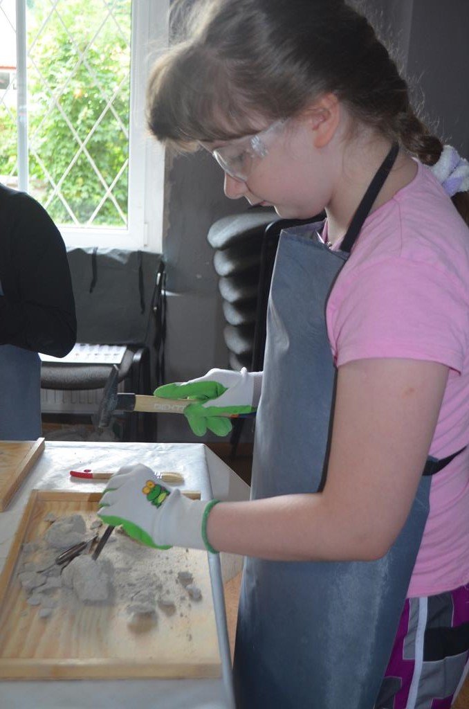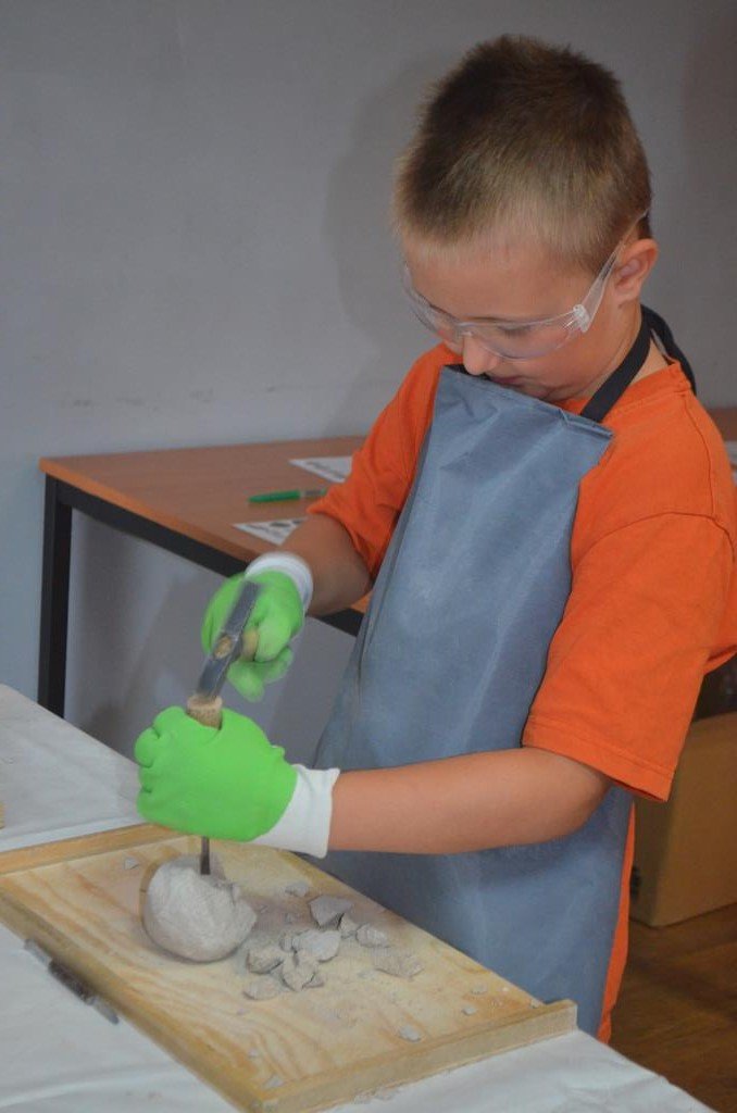 – MAŁY ODKRYWCA – dzieci otrzymały kulę piaskowo – gipsową, w której ukryte były pradawne ślimaki, małże, czy też belemnity. Do ich wydobycia małym odkrywcom posłużył wcześniej przygotowany warsztat pracy, a mianowicie: młotek, dłuto i pędzelek oraz ochronny fartuch i okulary.