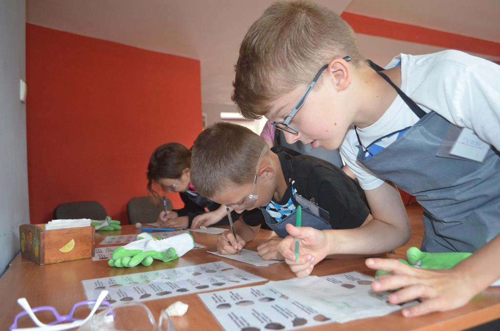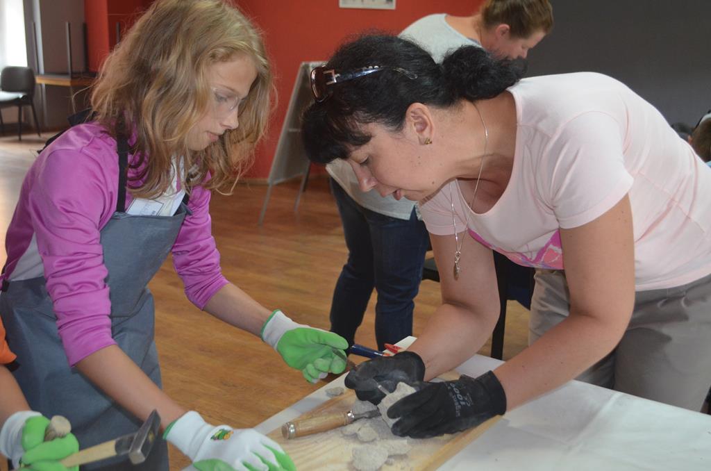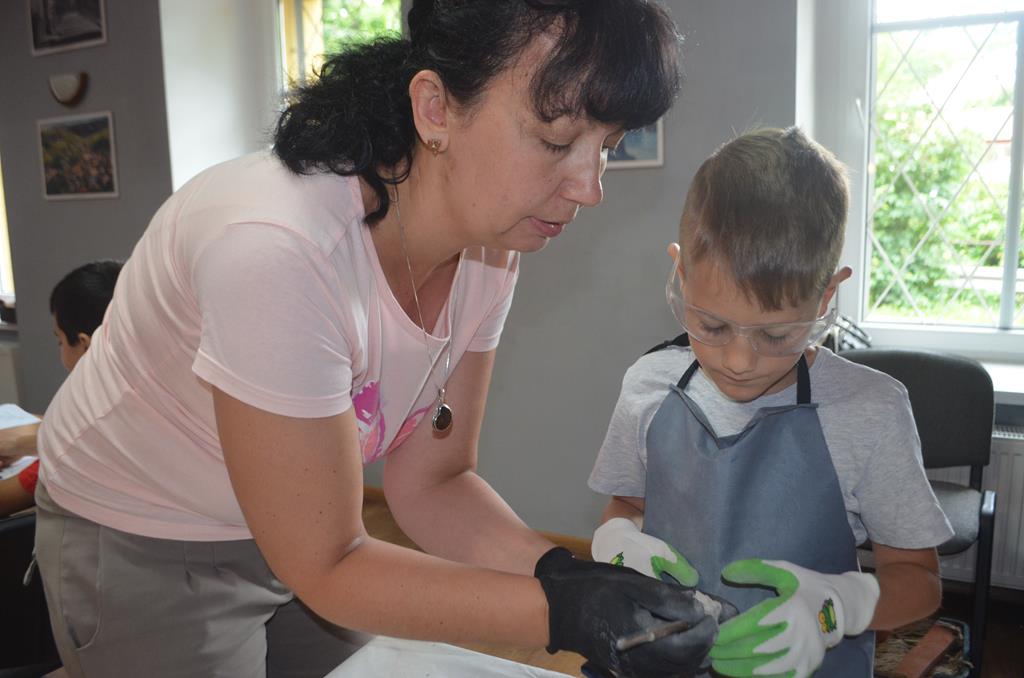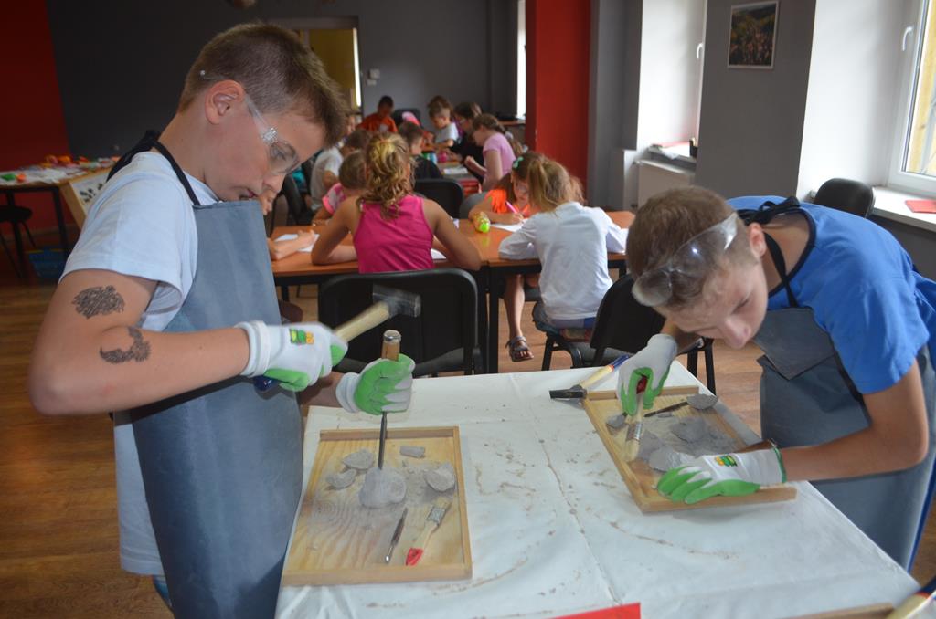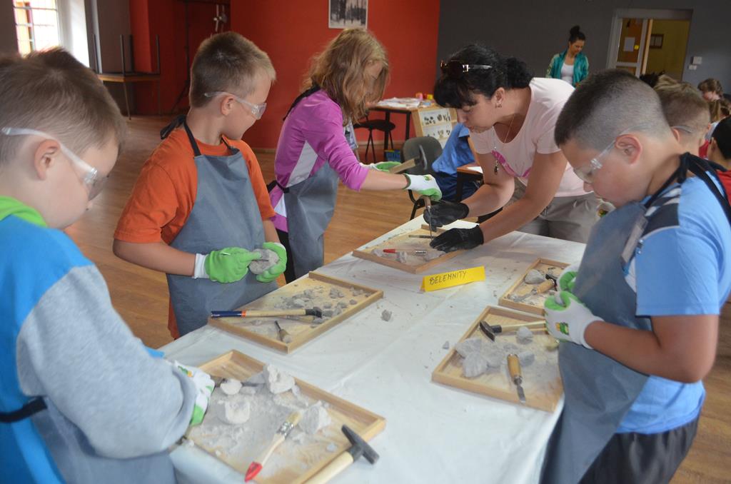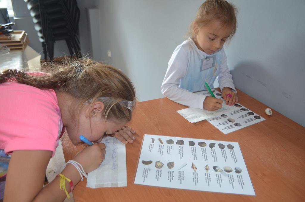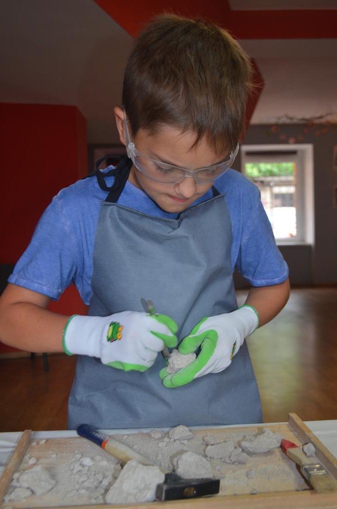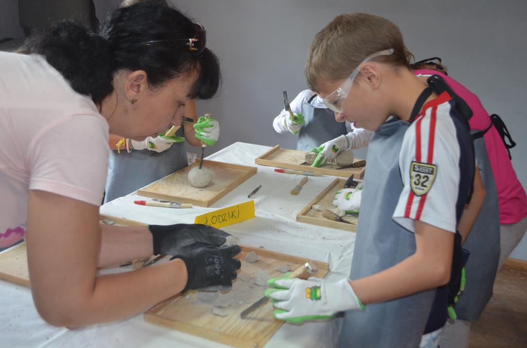 – MAŁY ODKRYWCA – dzieci otrzymały kulę piaskowo – gipsową, w której ukryte były pradawne ślimaki, małże, czy też belemnity. Do ich wydobycia małym odkrywcom posłużył wcześniej przygotowany warsztat pracy, a mianowicie: młotek, dłuto i pędzelek oraz ochronny fartuch i okulary.