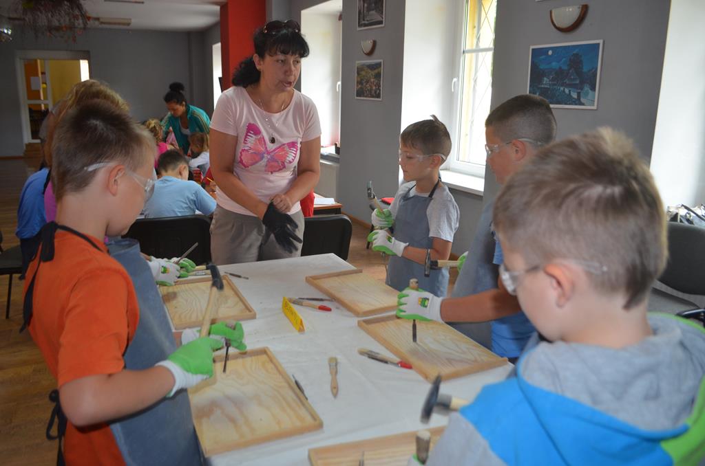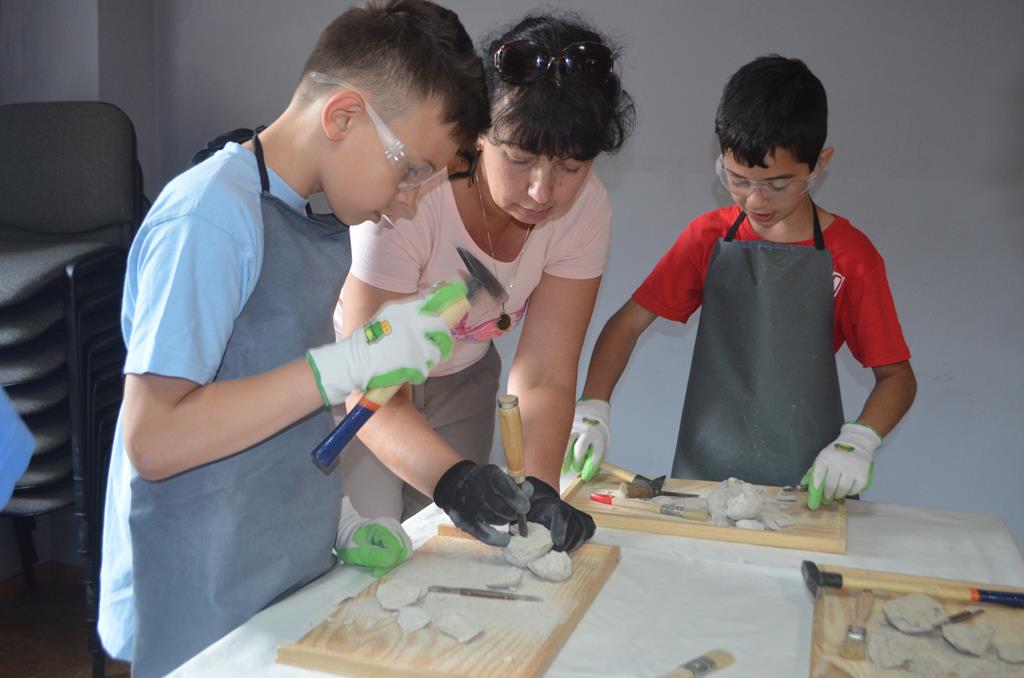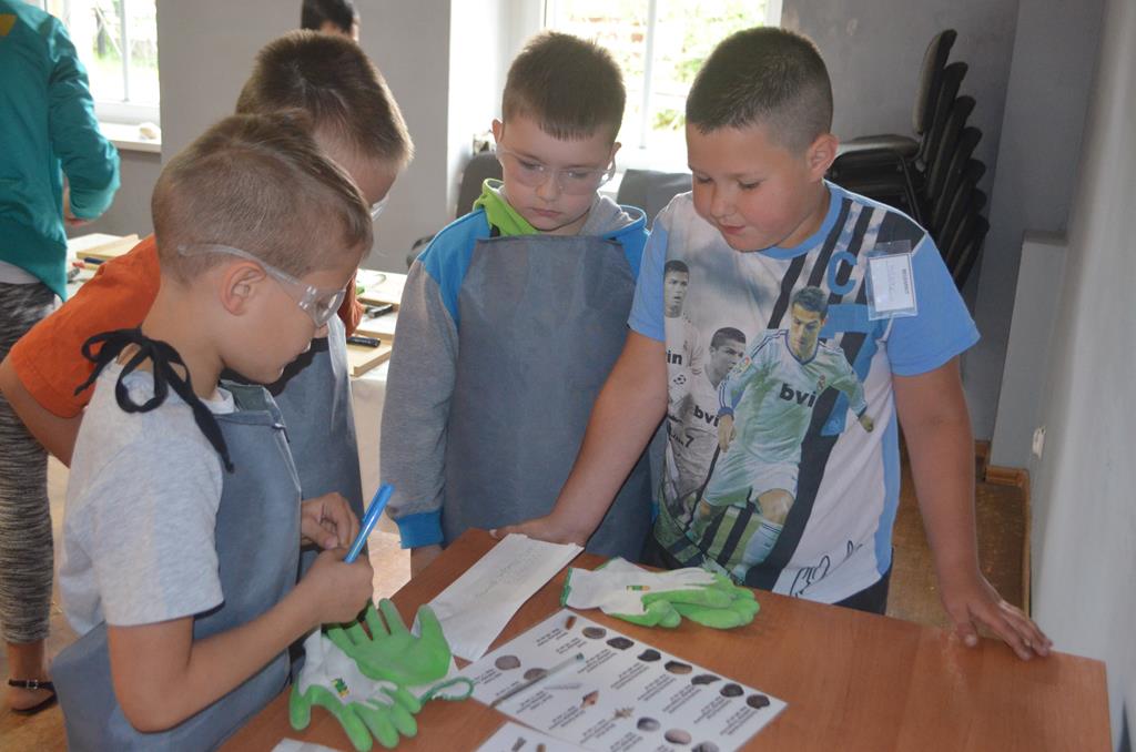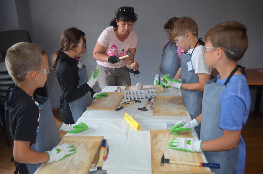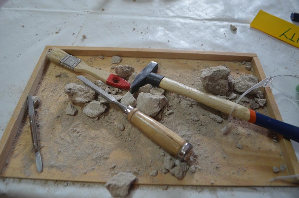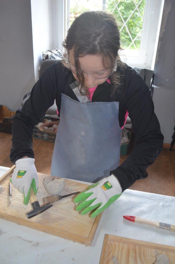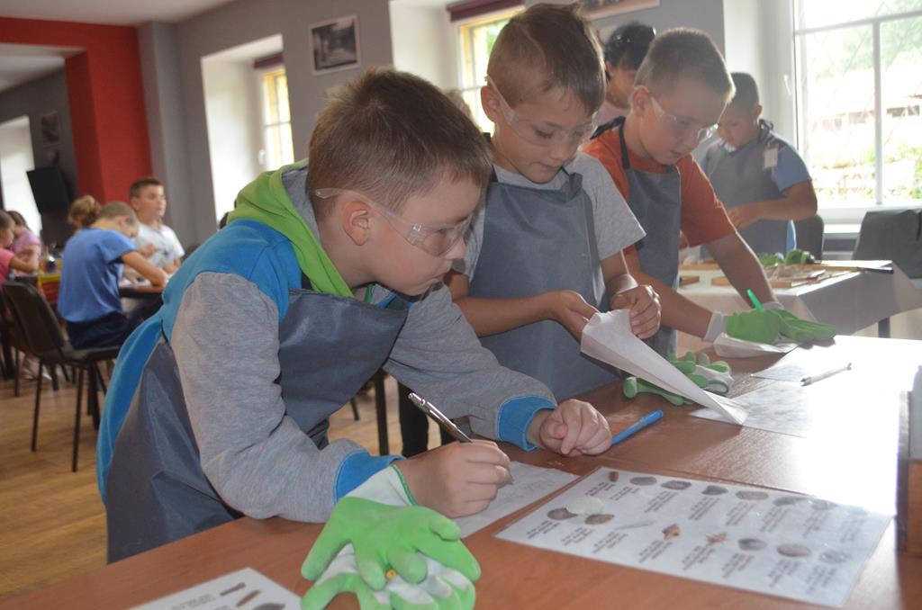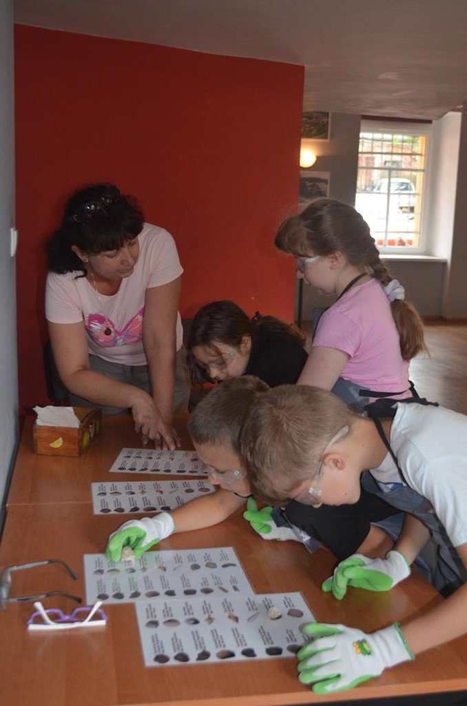 – MAŁY ODKRYWCA – dzieci otrzymały kulę piaskowo – gipsową, w której ukryte były pradawne ślimaki, małże, czy też belemnity. Do ich wydobycia małym odkrywcom posłużył wcześniej przygotowany warsztat pracy, a mianowicie: młotek, dłuto i pędzelek oraz ochronny fartuch i okulary.