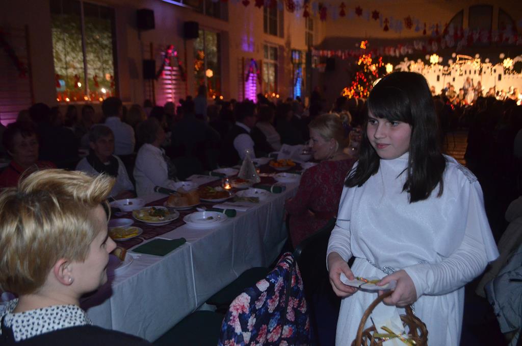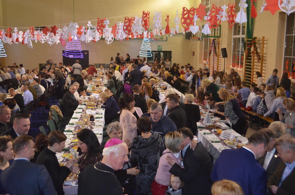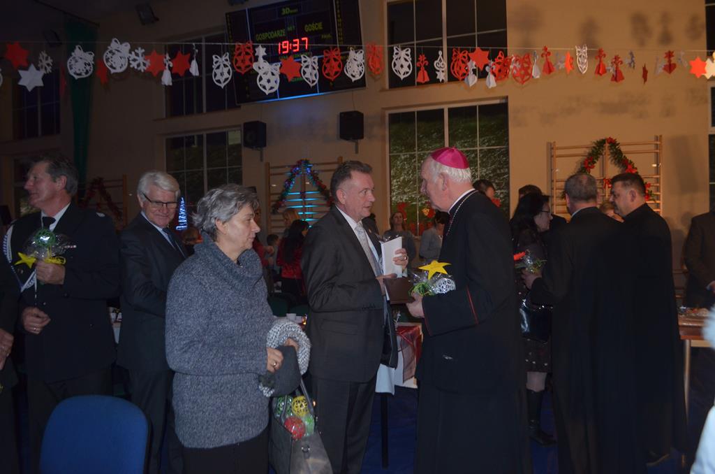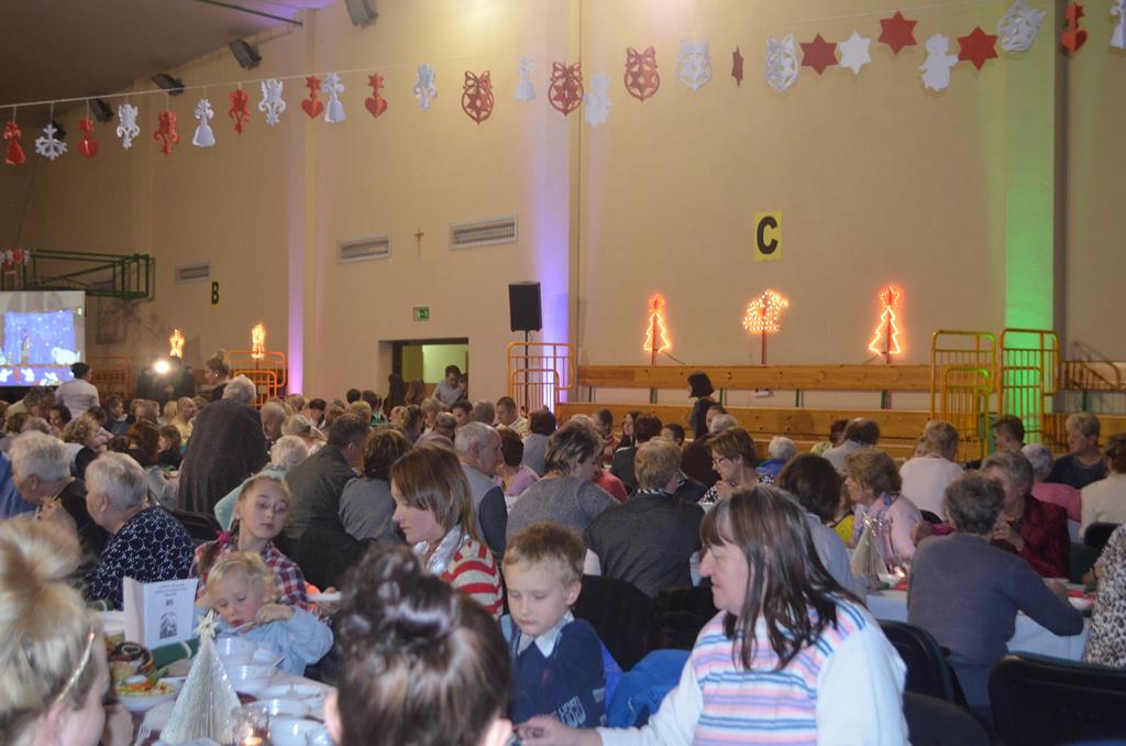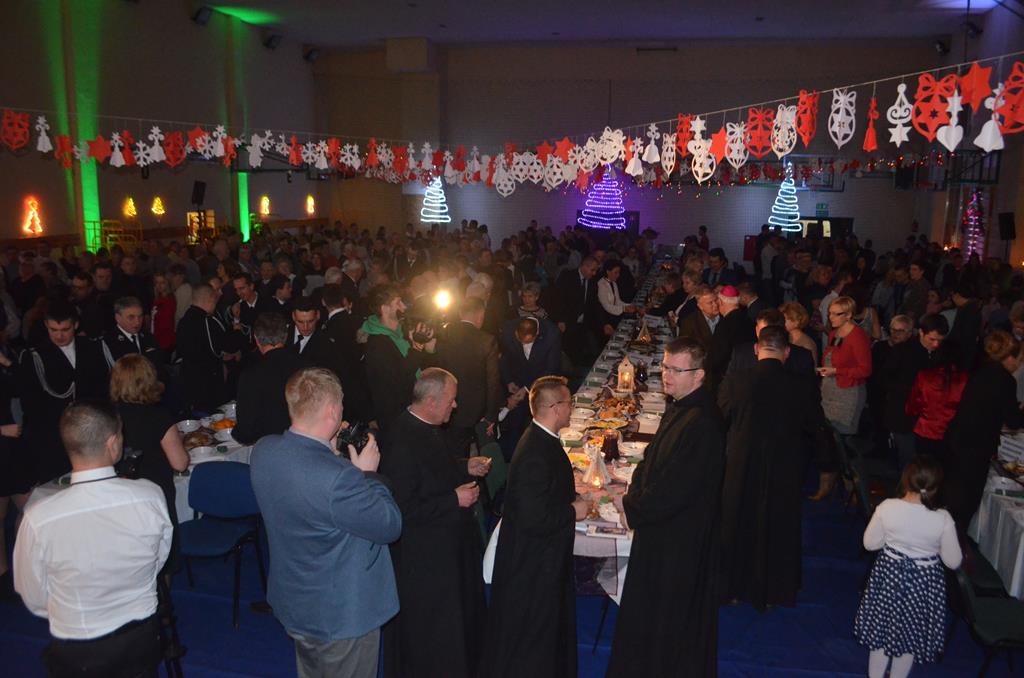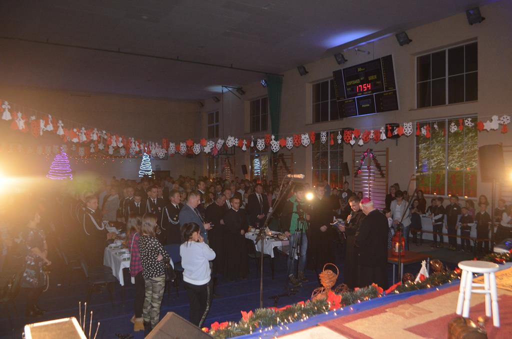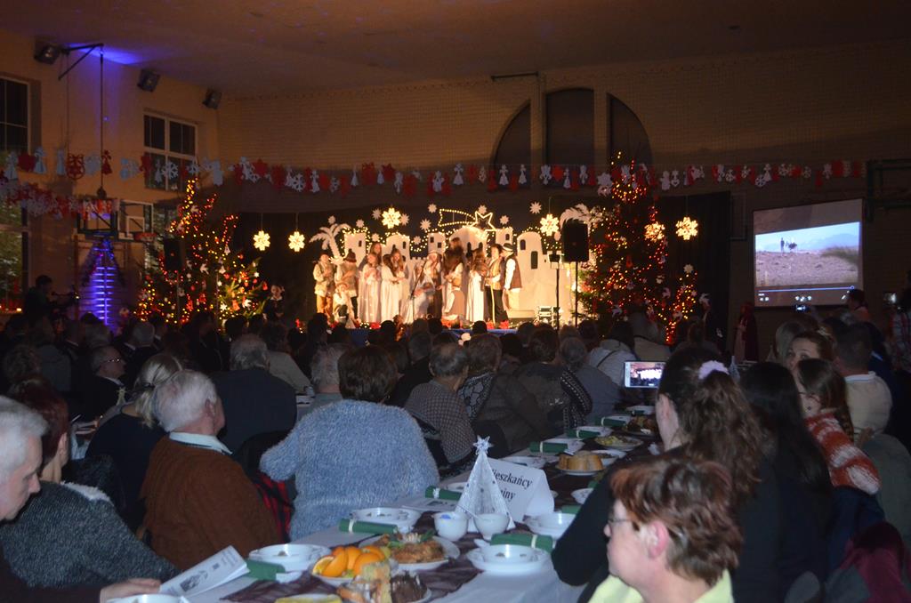 Po nabożeństwie wszyscy udali się do świątecznie przystrojonej hali sportowej w Centrum Sportu i Rekreacji, by wspólnie odczuć czar i magię nadchodzących świąt. Przy udekorowanych stołach, zastawionych tradycyjnymi potrawami wigilijnymi, nastąpiło błogosławieństwo wszystkich przybyłych przez księdza Biskupa, po którym połamano się symbolicznym opłatkiem. Dzieci z Publicznej Szkoły Podstawowej im. Janusza Korczaka w Jugowicach przygotowały jasełka, podczas których przypomniały obecnym historię narodzin Jezusa. Przepiękna sceneria, profesjonalna oprawa artystyczna oraz pełna zaangażowania gra aktorska małych mieszkańców gminy, wywoływały zarówno emocje zachwytu, jak i wzruszenia.