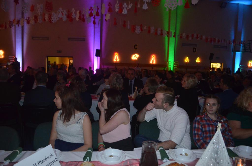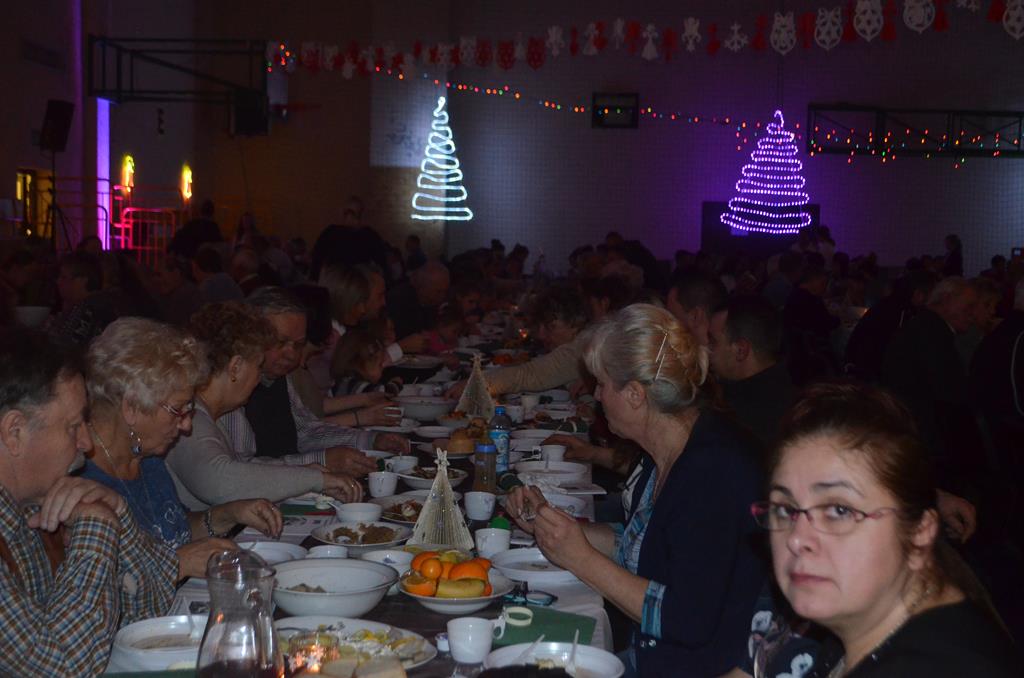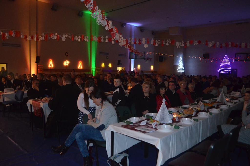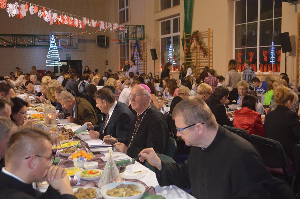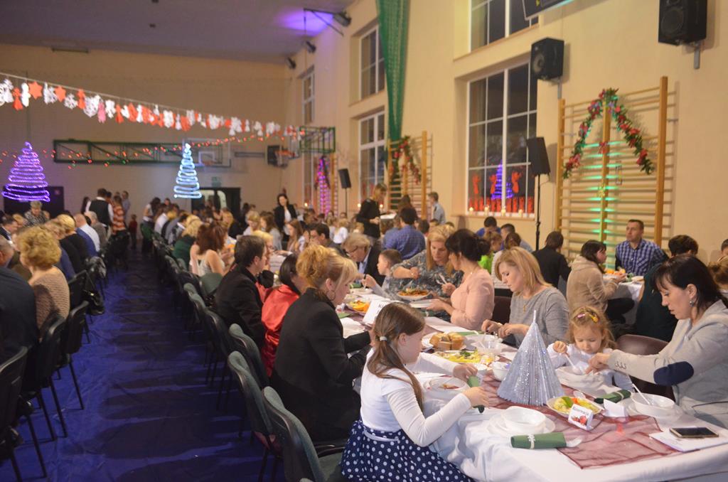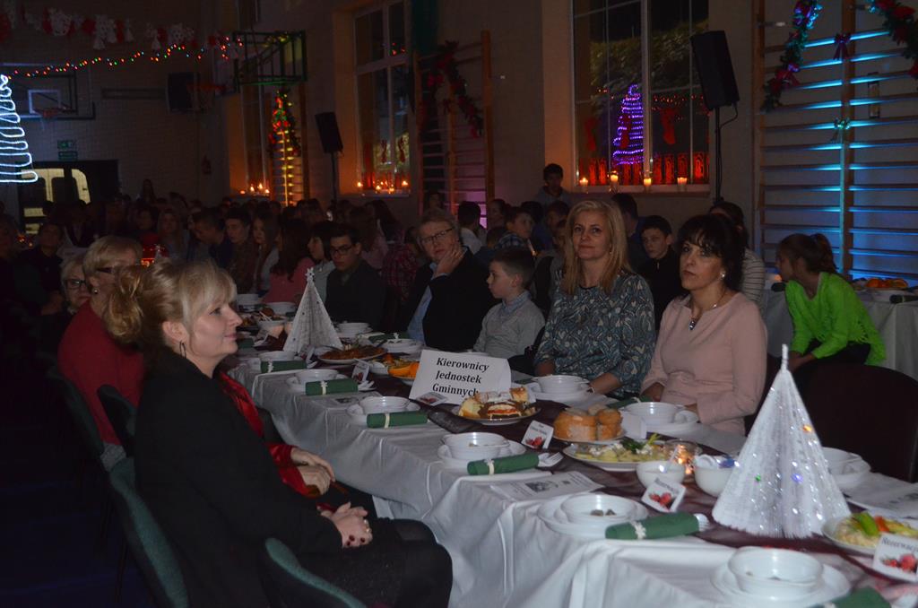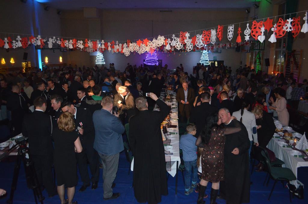 Po nabożeństwie wszyscy udali się do świątecznie przystrojonej hali sportowej w Centrum Sportu i Rekreacji, by wspólnie odczuć czar i magię nadchodzących świąt. Przy udekorowanych stołach, zastawionych tradycyjnymi potrawami wigilijnymi, nastąpiło błogosławieństwo wszystkich przybyłych przez księdza Biskupa, po którym połamano się symbolicznym opłatkiem. Dzieci z Publicznej Szkoły Podstawowej im. Janusza Korczaka w Jugowicach przygotowały jasełka, podczas których przypomniały obecnym historię narodzin Jezusa. Przepiękna sceneria, profesjonalna oprawa artystyczna oraz pełna zaangażowania gra aktorska małych mieszkańców gminy, wywoływały zarówno emocje zachwytu, jak i wzruszenia.