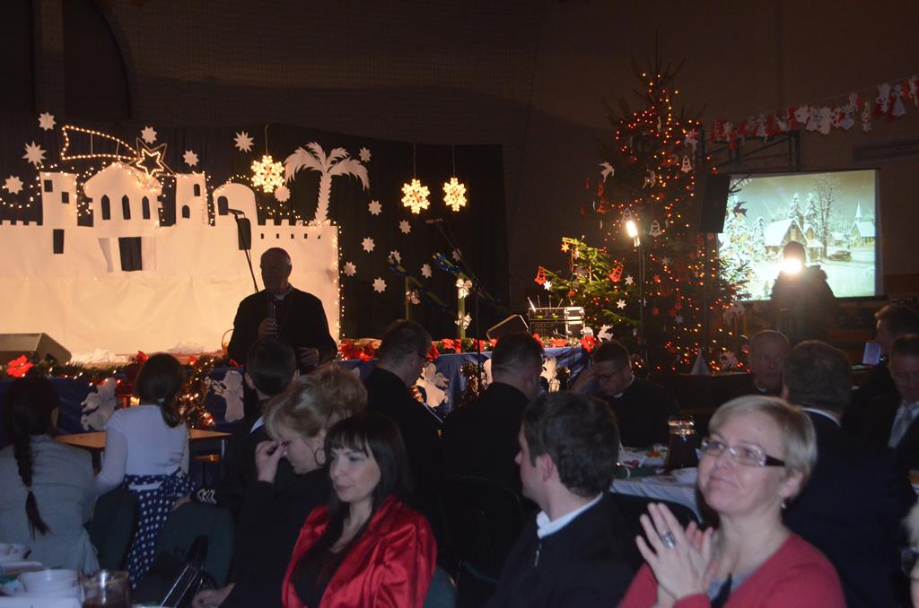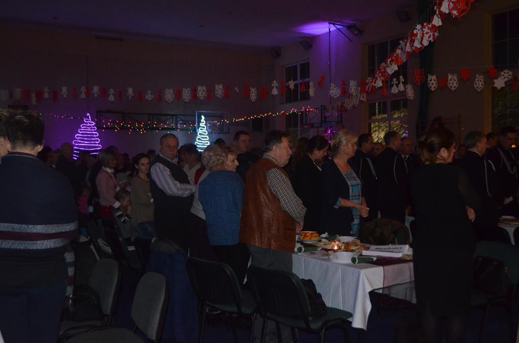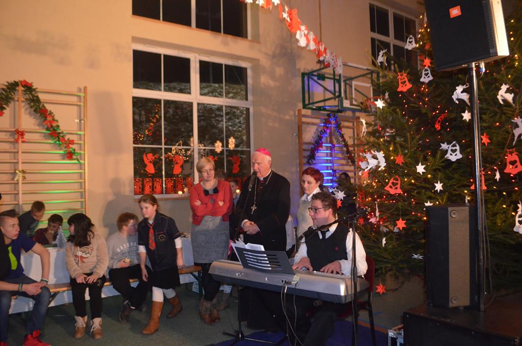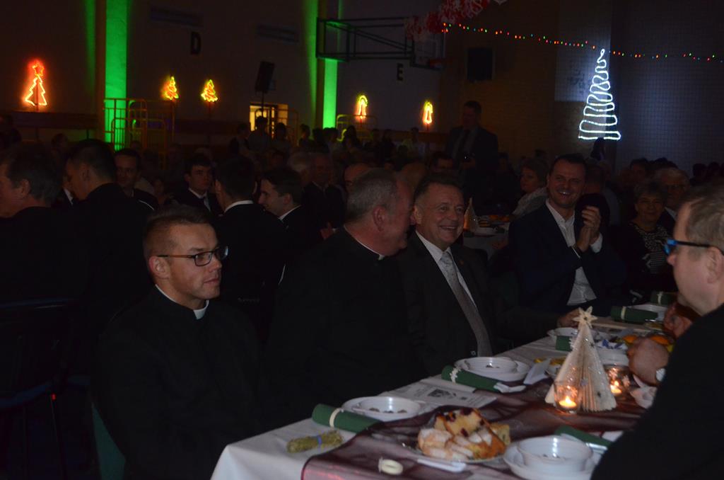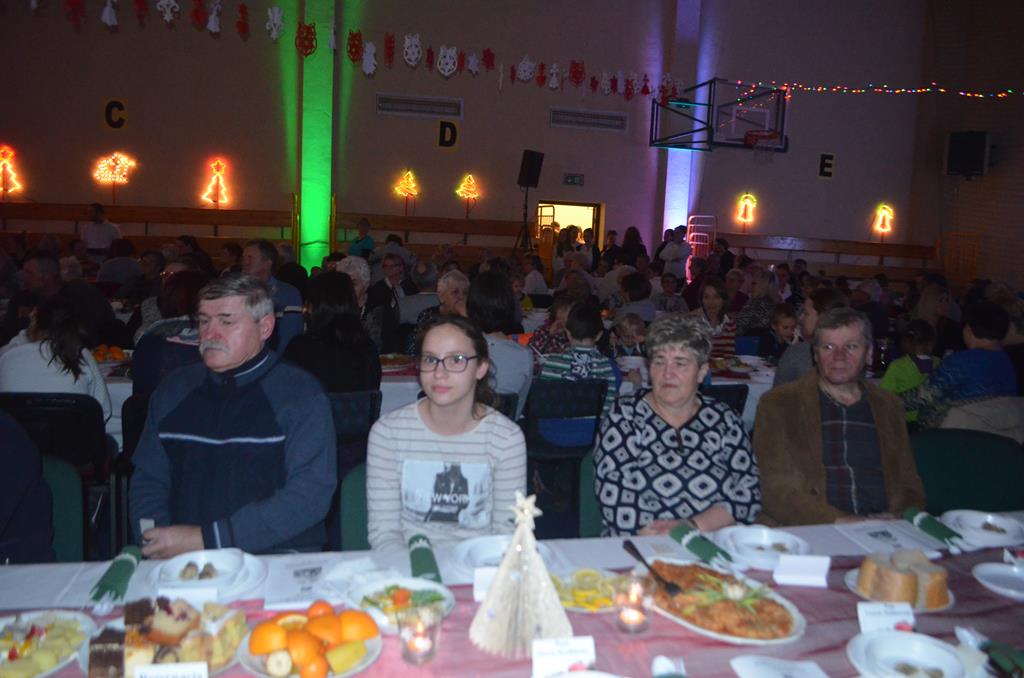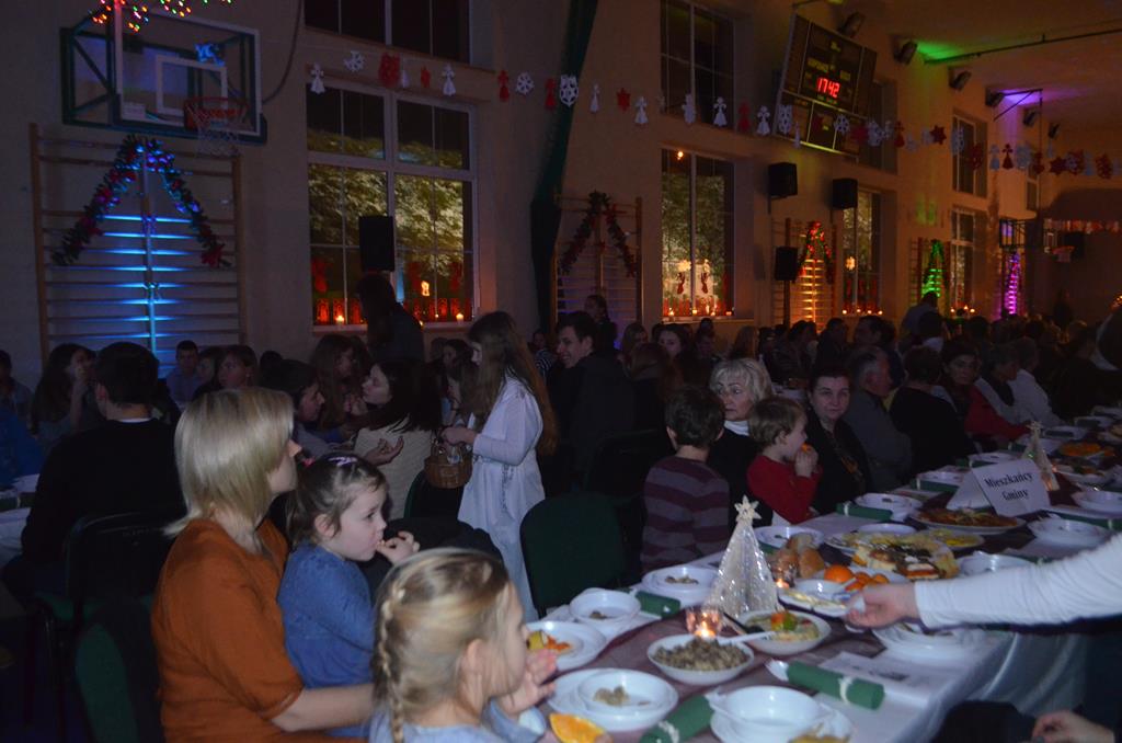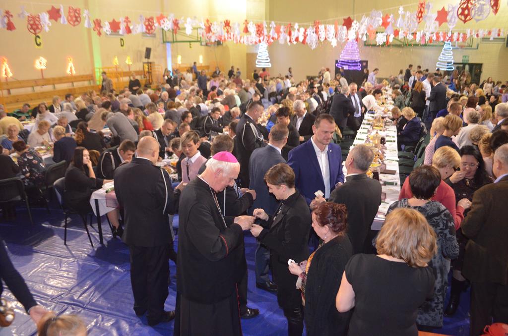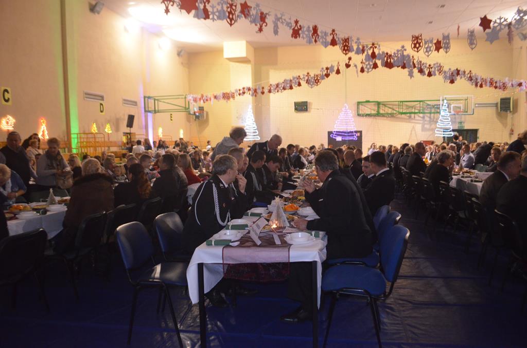 Po nabożeństwie wszyscy udali się do świątecznie przystrojonej hali sportowej w Centrum Sportu i Rekreacji, by wspólnie odczuć czar i magię nadchodzących świąt. Przy udekorowanych stołach, zastawionych tradycyjnymi potrawami wigilijnymi, nastąpiło błogosławieństwo wszystkich przybyłych przez księdza Biskupa, po którym połamano się symbolicznym opłatkiem. Dzieci z Publicznej Szkoły Podstawowej im. Janusza Korczaka w Jugowicach przygotowały jasełka, podczas których przypomniały obecnym historię narodzin Jezusa. Przepiękna sceneria, profesjonalna oprawa artystyczna oraz pełna zaangażowania gra aktorska małych mieszkańców gminy, wywoływały zarówno emocje zachwytu, jak i wzruszenia.