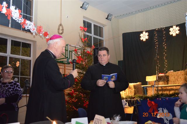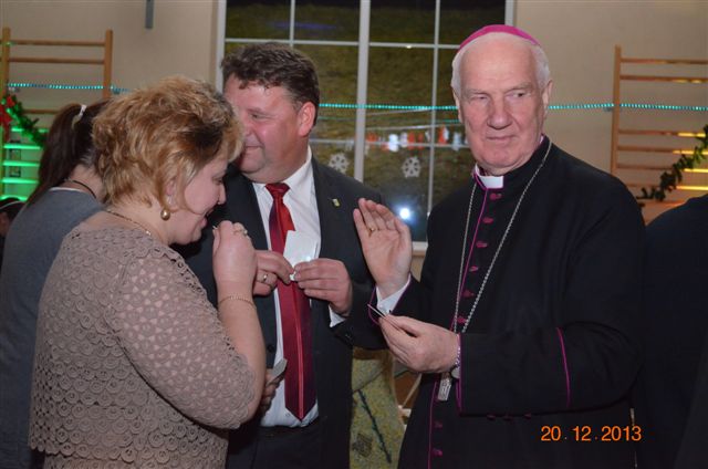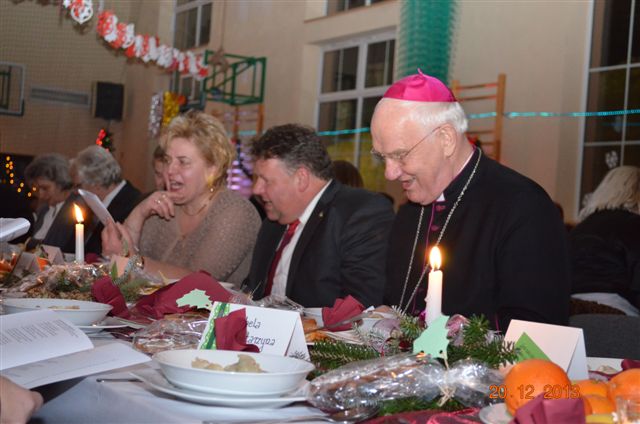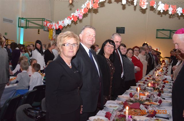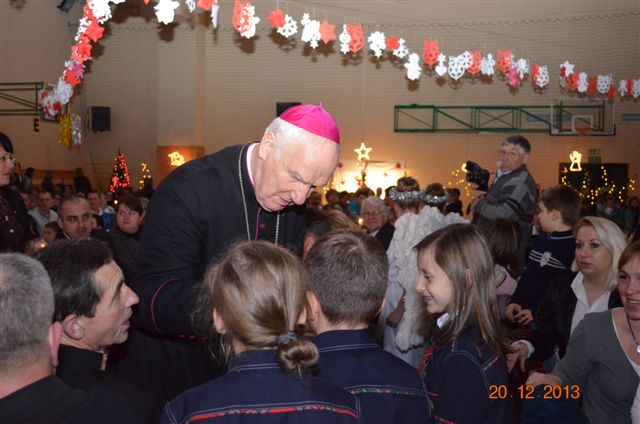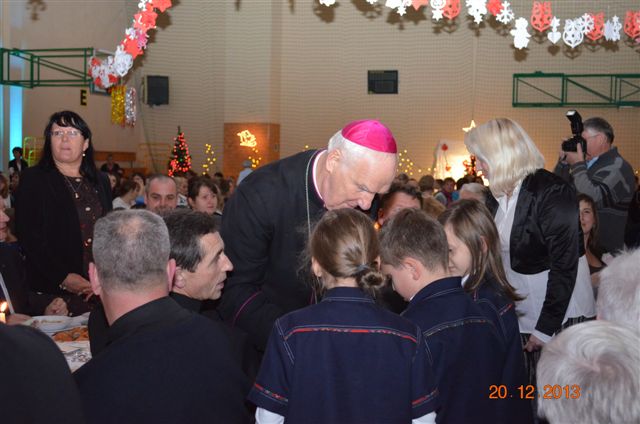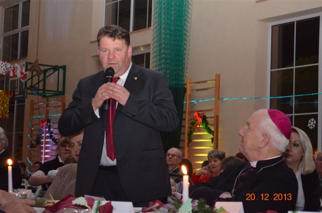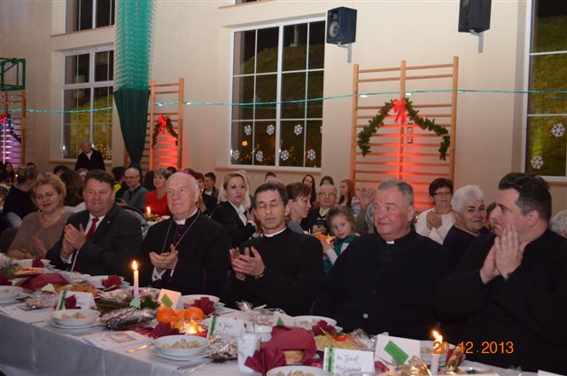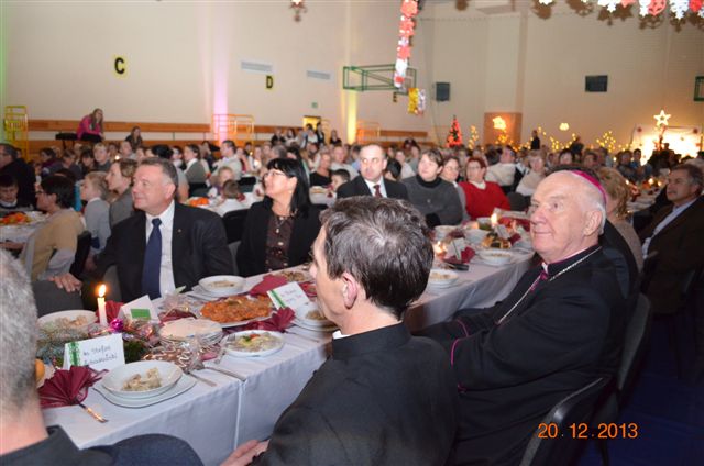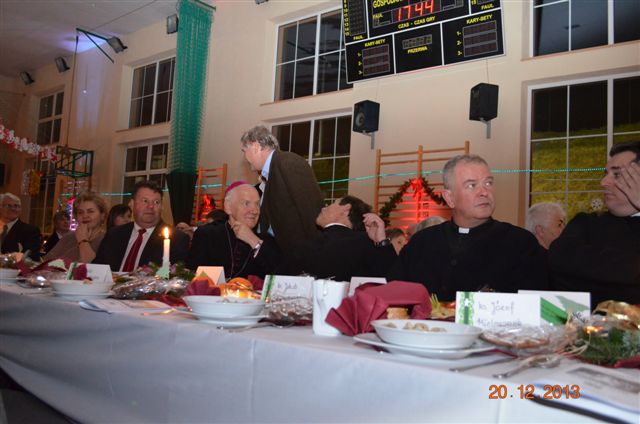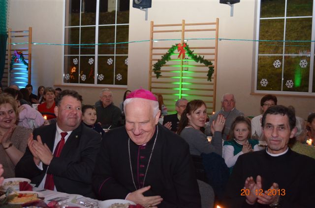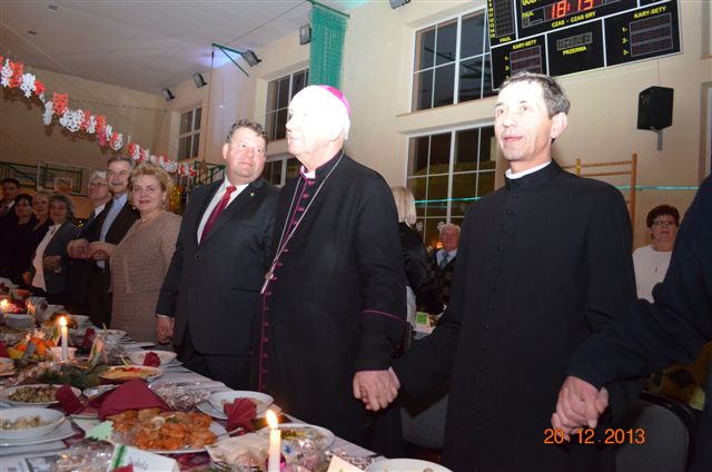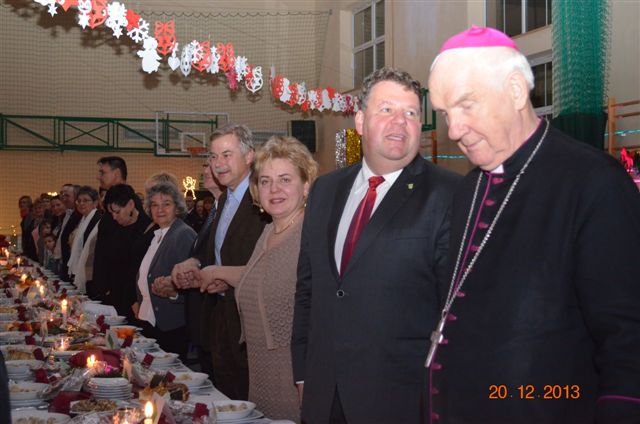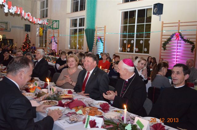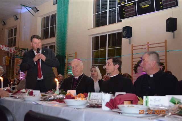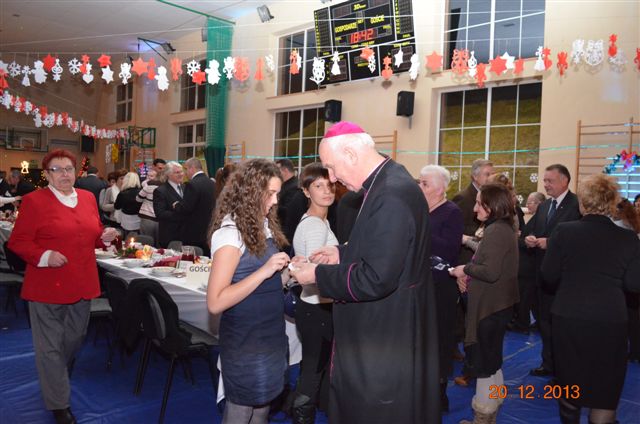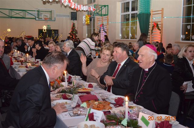 20 grudnia 2013 r. Mszą Świętą celebrowaną przez Jego Ekscelencję Księdza Biskupa Ignacego Deca wraz z księżmi z naszej gminy – ks. Stefanem Łobodzińskim, ks. Zygmuntem Mielczarkiem, ks. Jarosławem Zabłockim, rozpoczęło się Bożonarodzeniowe Spotkanie Opłatkowe w Gminie Walim. Przy ołtarzu asystowały szkolne oraz strażackie poczty sztandarowe. Na hali sportowej, przy pięknie zastawionych stołach, do wspólnej kolacji wigilijnej zasiedli mieszkańcy gminy wraz z zaproszonymi gośćmi – księdzem Biskupem Ignacym Decem, księżmi z parafii gminnych, Posłanką na Sejm Izabelą Katarzyną Mrzygłocką przedstawicielami Starostwa Powiatowego – Starostą Józefem Piksą oraz radnym powiatowym Krzysztofem Kwiatkowskim. Przy stołach zasiedli także radni Rady Gminy Walim, sołtysi naszych miejscowości, przyjaciele gminy, przedstawiciele Zjednoczonych Pasją oraz lokalni twórcy. Młodzież i dzieci z Zespołu Szkół w Walimiu przygotowały jasełka upamiętniające Narodzenie Pana, ale także przypominające, że Boże Narodzenie to czas zadumy i refleksji nad naszym życiem, ale przede wszystkim czas pokoju, zgody i miłości. Jego Ekscelencja Ksiądz Biskup Ignacy Dec złożył wszystkim najserdeczniejsze życzenia świąteczne, zaprosił do symbolicznego połamania się opłatkiem i wspólnej wieczerzy.Młodzież z Zespołu Placówek Resocjalizacyjnych w Walimiu przekazała, na ręce Wójta Gminy Walim Adama Hausmana, światełko betlejemskie. Było też wspólne kolędowanie. Ksiądz Biskup, zaintonował przy akompaniamencie pianina, nasze piękne polskie kolędy. Tradycyjnie, mieszkańcy obecni na Spotkaniu Opłatkowym, otrzymali stroiki świąteczne.