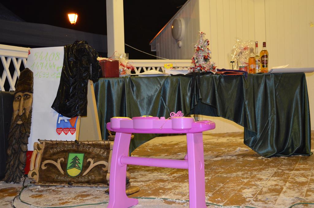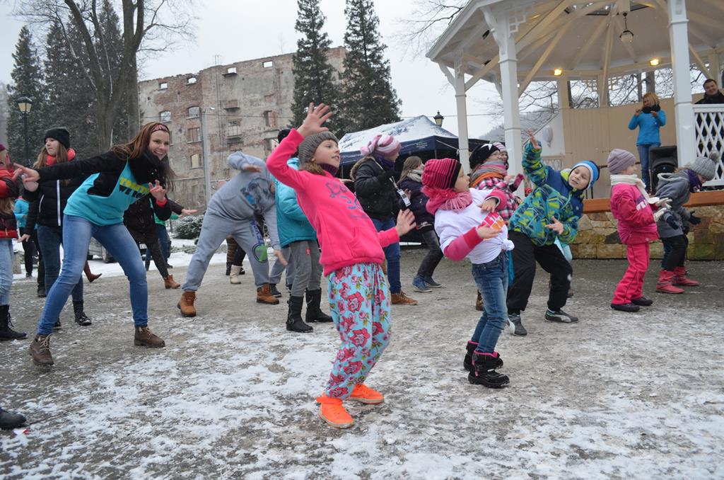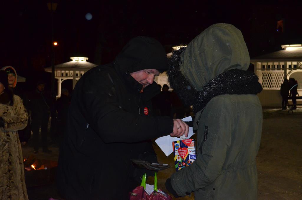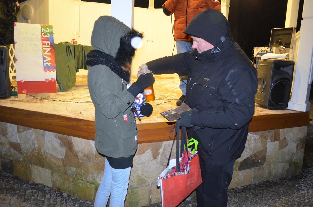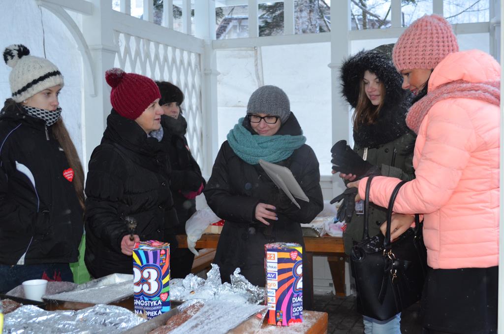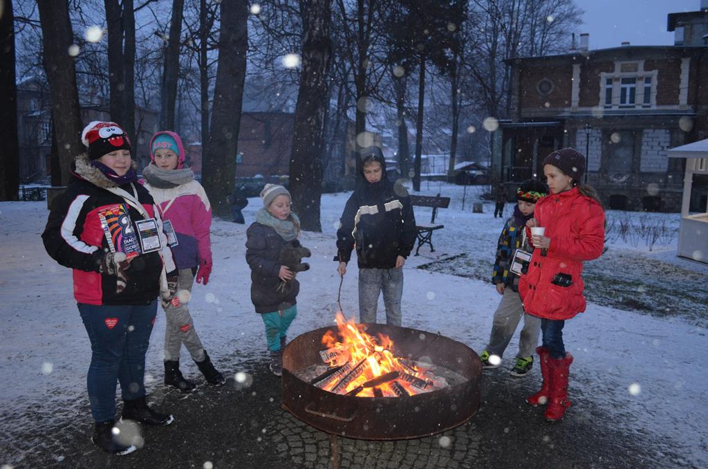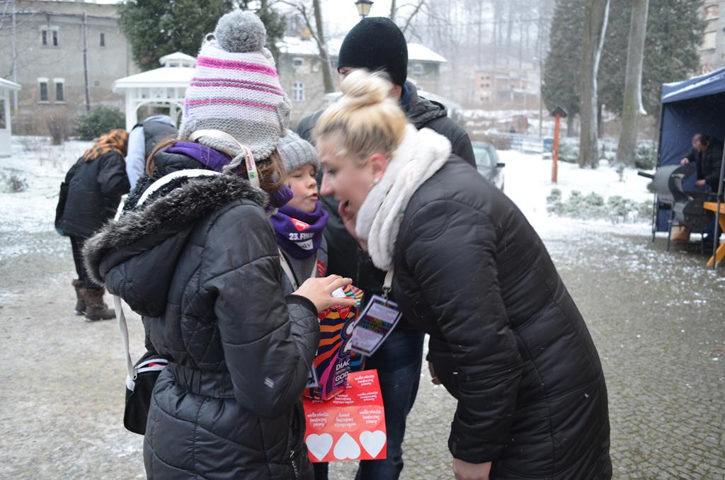 Po godzinie 14.00 w walimskim Parku Jordanowskim- gdzie odbywały się główne wielkoorkiestrowe obchody, zrobiło się niezwykle muzycznie. Najpierw dzięki tanecznym występom grupy Zumba Kids, wspomaganych przez rodziców, które za sprawą pani Beaty Rejek rozgrzewały i zachęcały wszystkich zebranych do wesołych pląsów. Następnie przy płonącym ognisku można było pośpiewać i pokołysać się w rytm utworów wyśpiewywanych przez Krzysztofa Gołębiewskiego. Miłośnicy dobrego jedzenia i pluszaków również mogli znaleźć coś dla siebie. Grono pedagogiczne Zespołu Szkół w Walimiu sprzedawało przepyszne słodkości, dzięki czemu uzbierali kwotę 678,06 zł. Zespół Placówek Resocjalizacyjnych pomagał przy akcji ” Kup misia”. Wszyscy zziębnięci mieli możliwość rozgrzania się kiełbasą wprost z grilla oraz gorącą kawą i herbatą serwowaną przez właścicieli Karczmy Rycerskiej Zamek Grodno. Duży “zastrzyk” gotówki podczas tegorocznego finału wpłynął z aukcji, zasilając naszą pulę kwotą 2.325,76 zł.